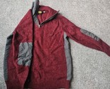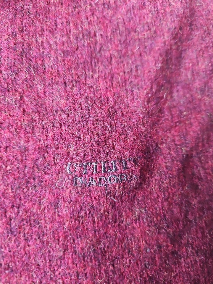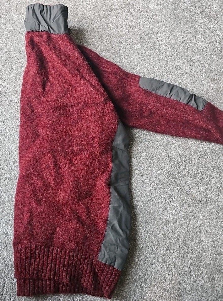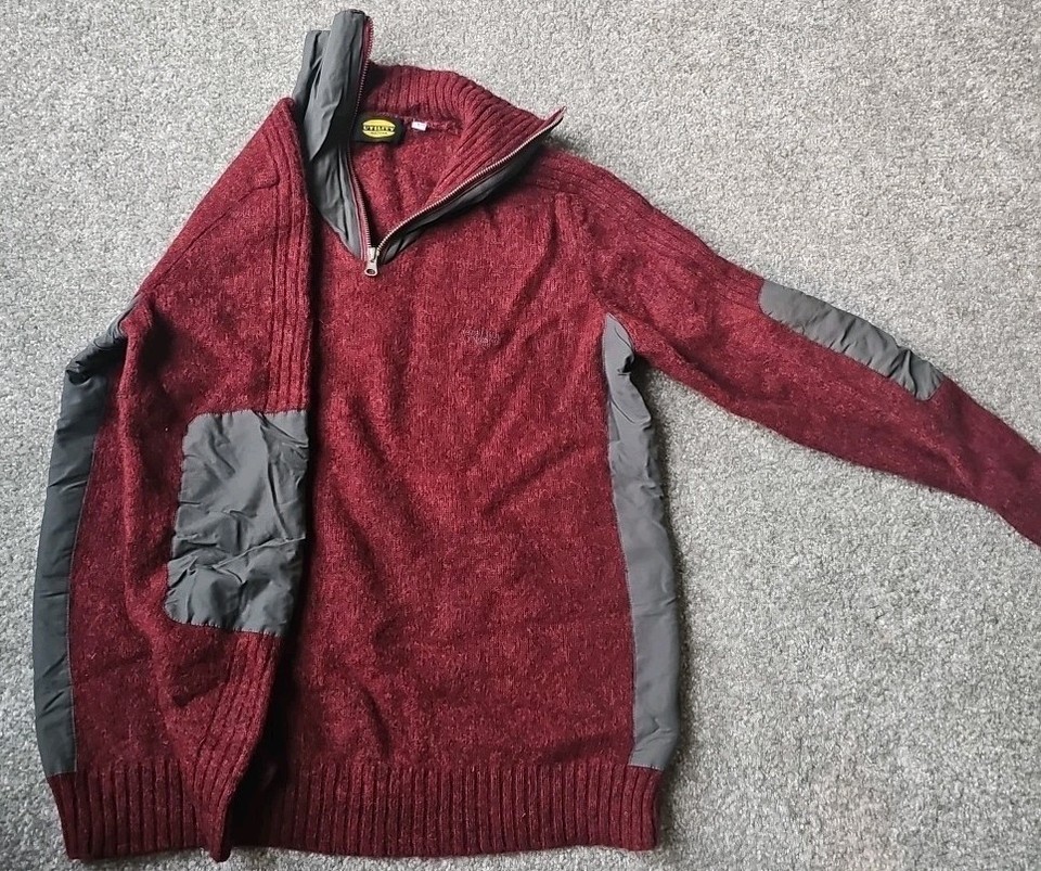 Red wool blend zip-up sweater by Utility Diadora, size L. Features reinforced grey patches on shoulders and elbows, zip collar, and ribbed cuffs and hem. Warm, durable, and stylish ? ideal for workwear or casual use.