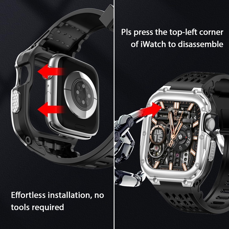 Smooth OperationThis Apple Watch band with metal case features clicky buttons and precise cutouts for smooth operation. The case has no bottom cover, allowing direct charging without removing it. It's easy to install without tools and provides a secure fit. To disassemble, press the top-left corner of the iWatch.