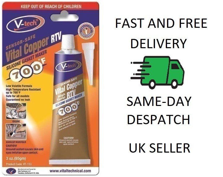 V-Tech Vital Copper RTV Silicone Instant Gasket Maker High Temp Rest 85gm TH49 Applications: Rear main bearing cap split line, damper keyway sealing, differential cover, intake end seals, OHC cap, oil pan corner seals, oil pan gasket, side cover plate, thermostat housing, timing cover, transmission pan, valve cover gasket, vibration damper, water pump cover gasket, intake manifolds and exhaust manifold.Packaging Size: 3 oz. (85gm) tube carded, 300gm/cartridge Description: Vital Copper RTV is specially designed for 4-cylinder, turbocharged or high performance engine that requiring a unique RTV Gasket. It is the most advanced, high temperature RTV silicone gasket currently available. It features low odor, non-corrosive with excellent oil resistance. It is three times more oil resistant than conventional silicone gasket and eight times more flexible than cut gaskets. It is permanently flexible and stable at temperature of between -80c to +700c (-62c to +370c) intermittent. It is also highly resistant to auto and shop fluids UK SELLER - FAST AND FREE DELIVERY - SAME DAY DESPATCH