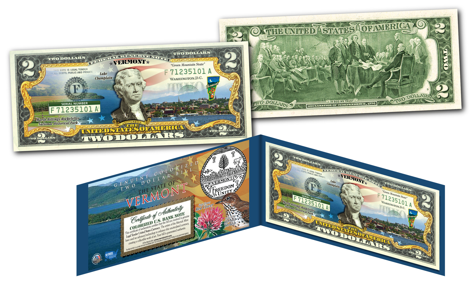 VERMONT Genuine Legal Tender $2 Bill USA Honoring America's 50 States