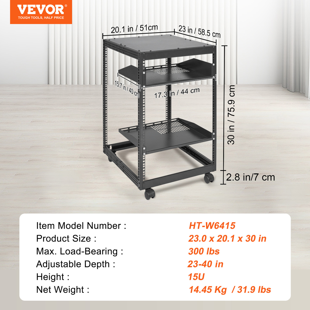 - VEVOR 15U Open Frame Server Rack, 23-40" Adjustable Depth, 4 Post with Casters