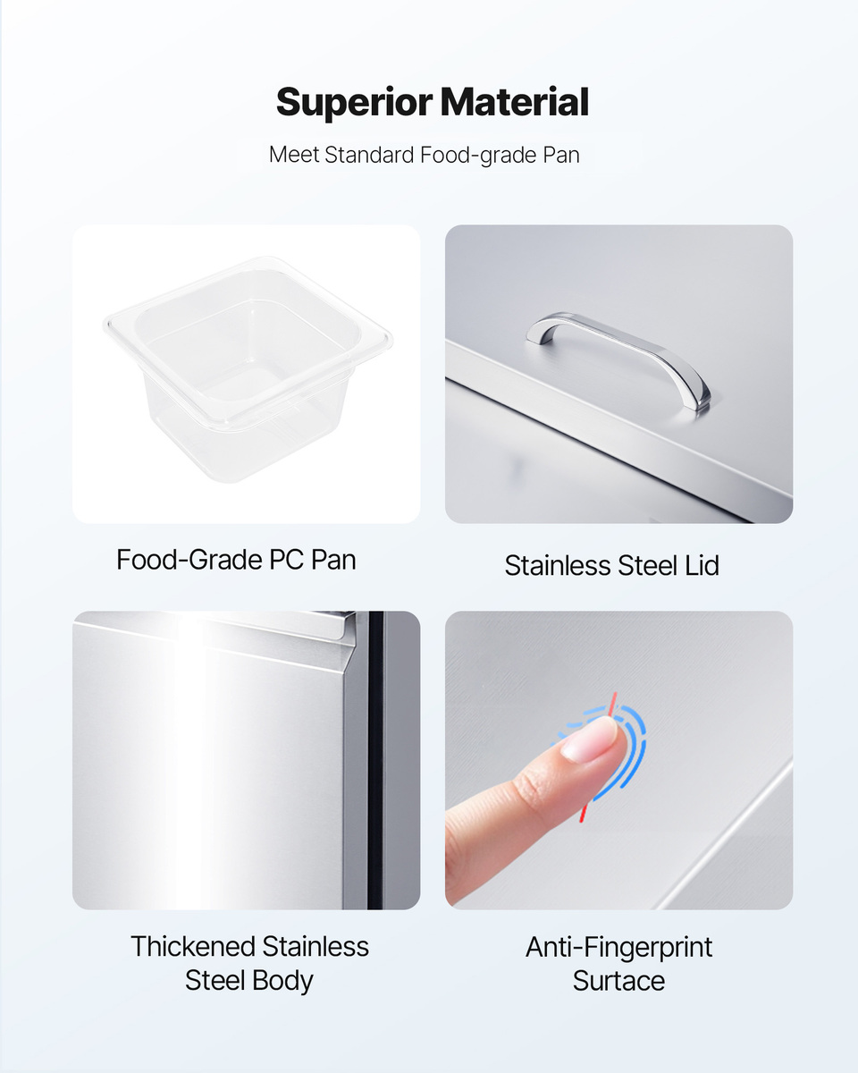 Premium Material: Food-grade PC pans meet ANSI tested standards, providing peace of mind for food storage. The sandwich fridge with stainless steel build is durable and easy to clean, with brake casters for smooth mobility