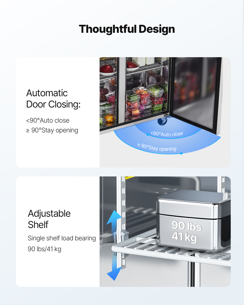Auto-Closing Door: When the door opens within 90, it automatically snaps shutโno need to push, and no cold air lost. The adjustable shelving in this sandwich prep cooler provides two-tier storage, with each shelf holding up to 90 lbs