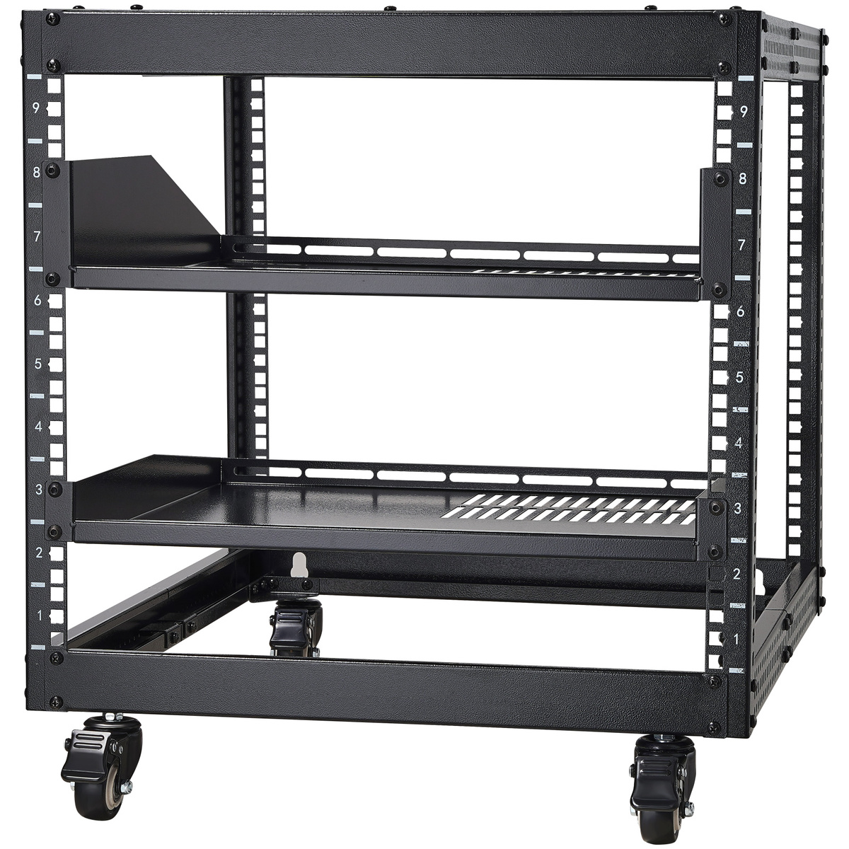 User-Friendly Design: Designed with your convenience in mind, this open frame server rack features an top shelf for extra storage and improved space utilization. The rolling casters let you move it effortlessly wherever you need it, making setup and movement a breeze.