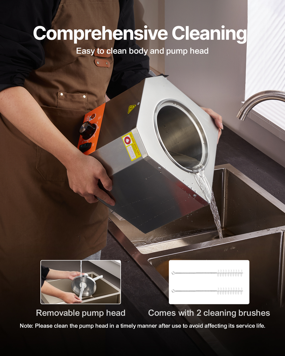 Effortless Cleaning: The cheese sauce dispenser is designed with separate food and water basins, and a detachable pump head for cleaning ease. This design facilitates simple water refilling and draining, and ensures comprehensive cleaning