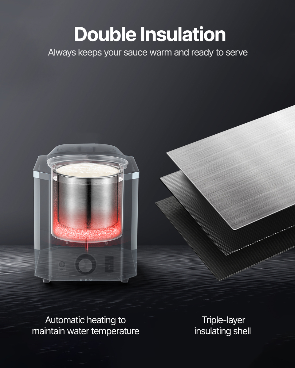 Food-Grade Materials: The sauce warmer is crafted from stainless steel. The inner lining, pump head, and inner cover utilize food-grade stainless steel, known for its rust resistance, high-temperature endurance, and anti-corrosion properties