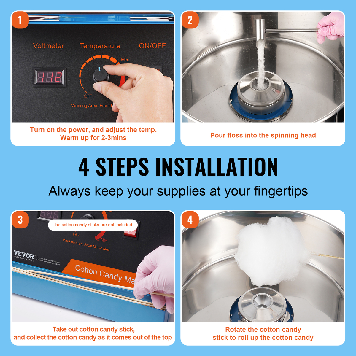 Easy-Operating Process: Using this machine couldn't be easier. Turn on the power, adjust the temperature, warm up for 2-3 minutes, and pour sugar into the spinning head, and then you just need to use the sticks to collect the cotton candies from the head.