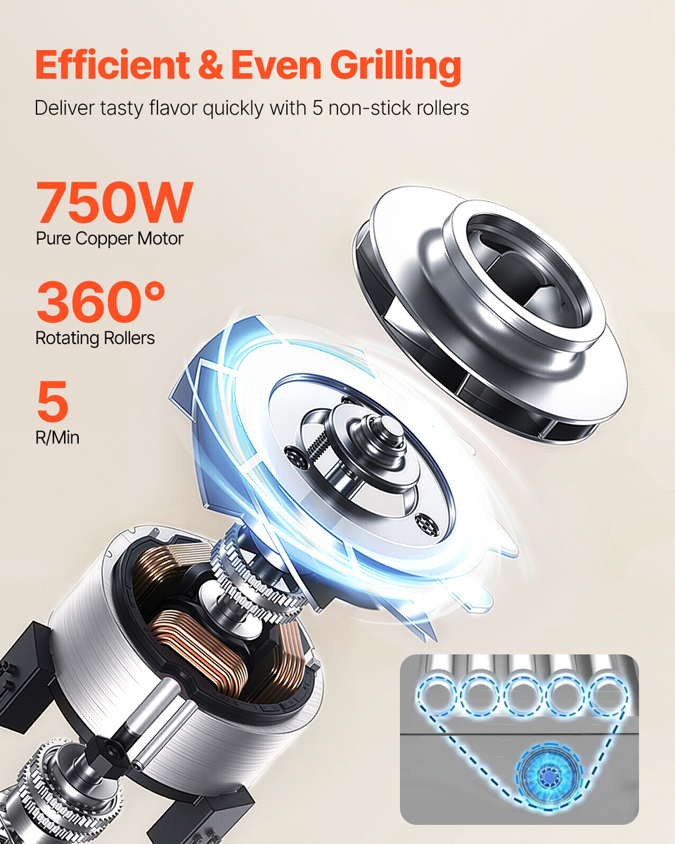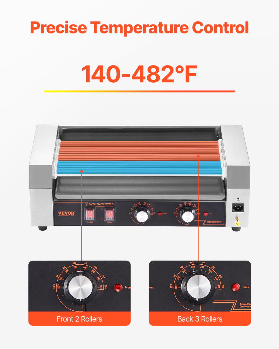 Precise Temperature Control: Two knobs made it effortless to adjust the cooking temperature up to 482F separately for front and back rollers. The left knob controls the front 2 rollers, and the right knob controls the back 3 rollers
