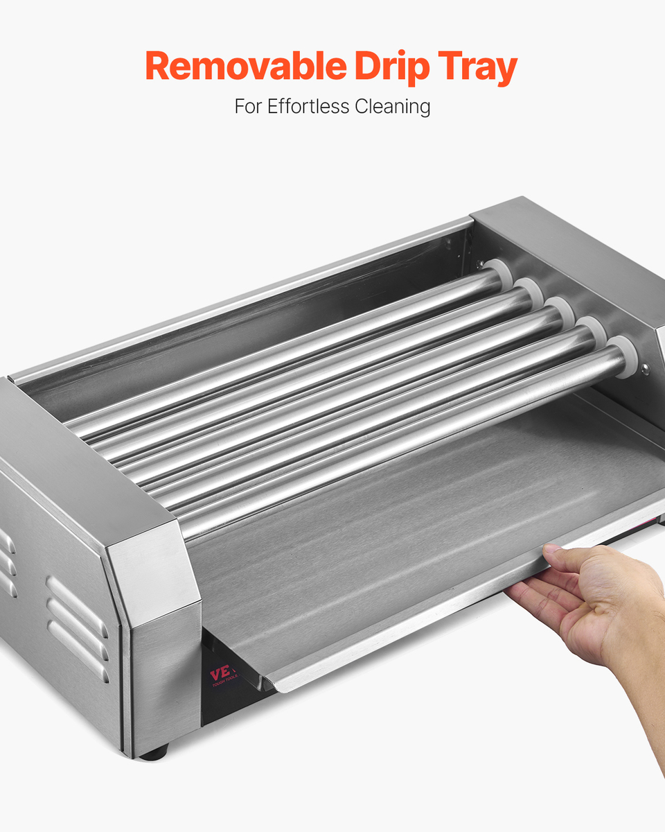 Built to Impress Last: Built with a durable, sleek stainless steel frame, this commercial hot dog roller provides not only a modern look but also long-lasting performance. The removable drip tray keeps your kitchen clean and washing to a minimum
