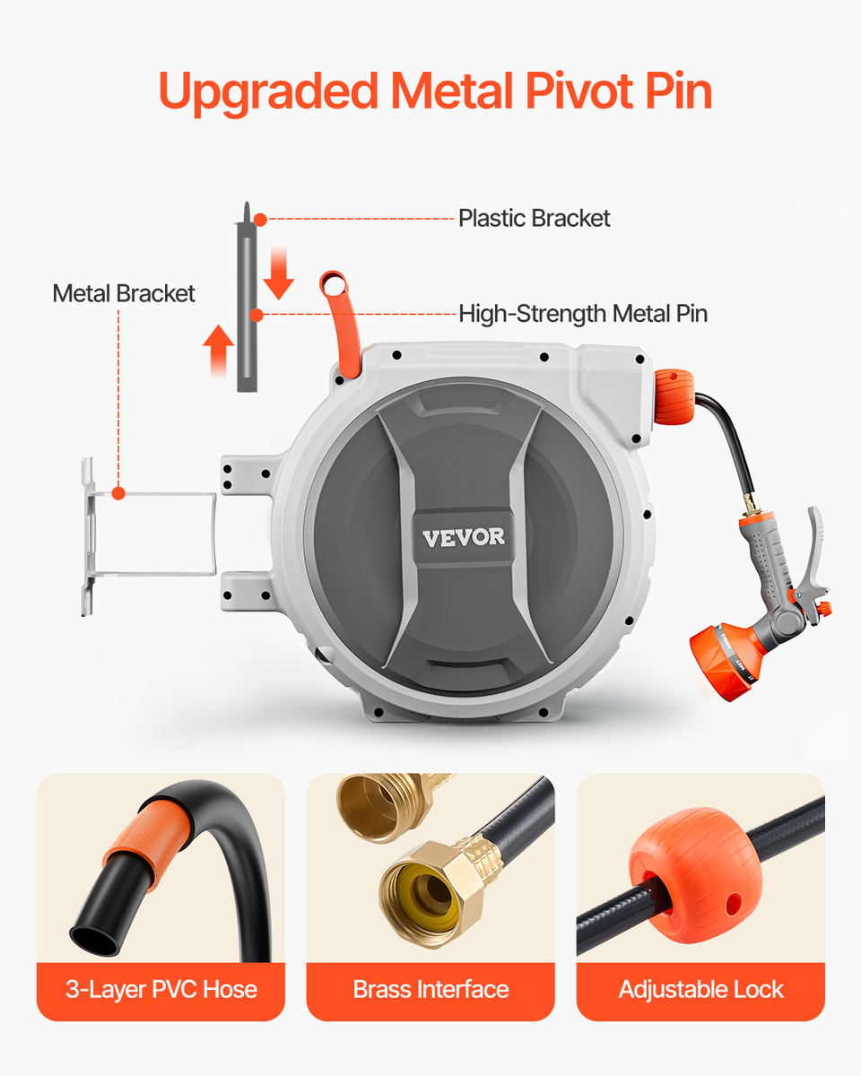 - VEVOR Retractable Hose Reel, 100 ft x 1/2 inch, 180° Swivel Bracket Wall-Mounted