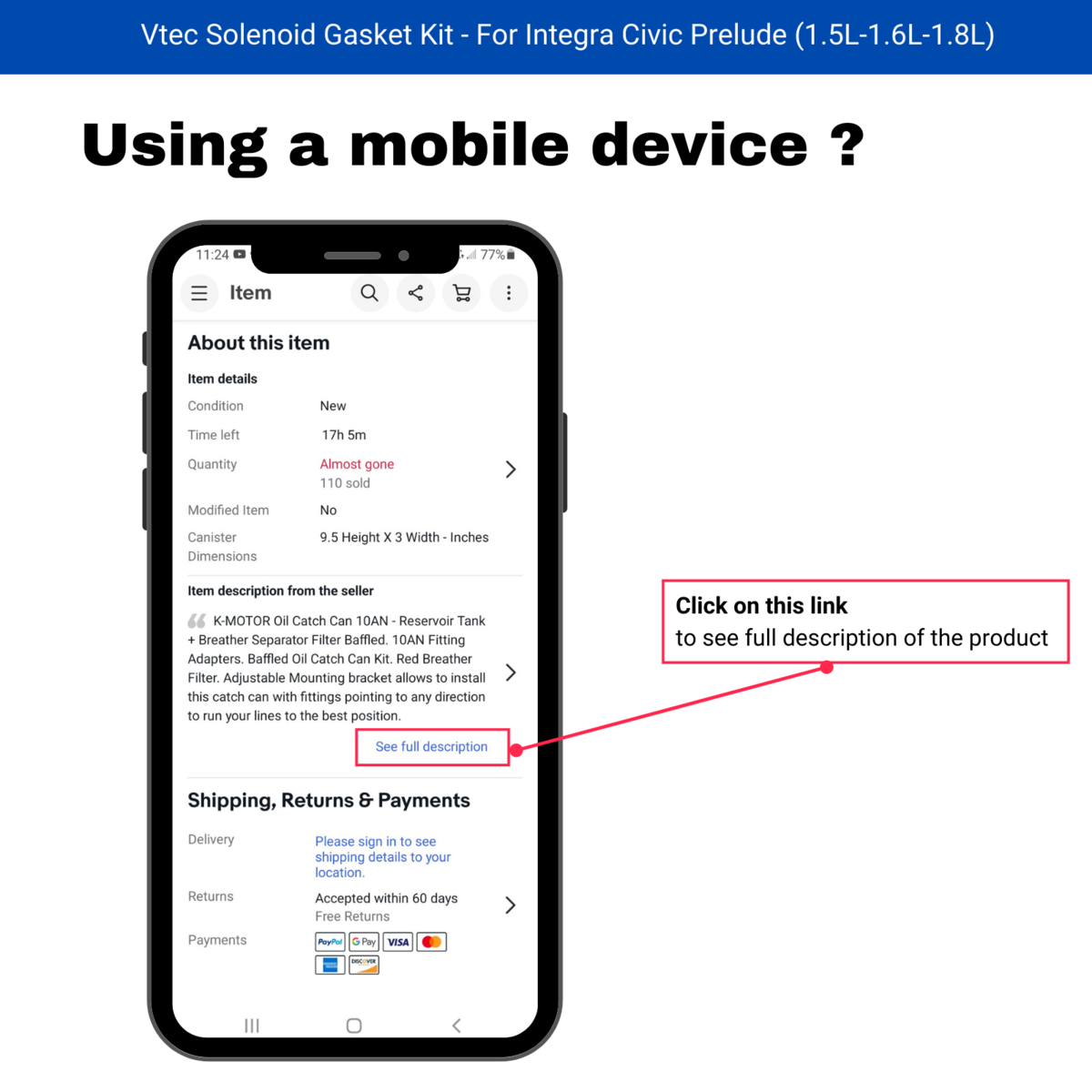 Powered by Frooition ALL PRODUCTS CUSTOMER FEEDBACK CONTACT US VTEC Solenoid Gasket Kit - For Integra Civic Prelude (1.5L-1.6L-1.8L) R20 RACING Item Description VTEC Solenoid Gasket Kit - For Integra Civic Prelude (1.5L-1.6L-1.8L) Engine Vtec Solenoid Gasket, also known as Spool Valve Variable timing solenoid. Located on the engine head near the distributor. Usually they start leaking oil because the old gasket is broken due to engine temperature. This gasket kit will replace all 3 gaskets on the valve. Features Assembled in USA Direct Replacement Made of Quality Material Extreme Heat Oil Resistance Durable Gasket - Leak Proof Seal Compatible Models: Compatible with Honda Civic 1988 to 1995 Compatible with Honda Civic Del Sol 1993 to 1997 Compatible with Honda CRX 1988 to 1991 Compatible with Acura Integra 1990 to 2001 Compatible with Honda Prelude 1997 to 2001 Compatible with Honda Civic 1999 to 2000 (DOHC V-Tec B16 Engine Code) Engine Code: D15, D16Z6, B16, B18, B20, H22 Engine Important Note: Not compatible with 1996 to 2000 Civic with 1.6L SOHC (D16Y7 D16Y8 Code Engine) Package Includes: One (1) upper gasket One (1) lower gasket One (1) pressure switch O-ring Note: This is an aftermarket replacement product produced by K-MOTOR PERFORMANCE We have no affiliation with or endorsement from any of the manufacturers mentioned above. More Items! View more great items K-MOTOR Vtec Solenoid Gasket Spool Valve Fits 1996-2005 Honda Civic D16Y D17 dollar;13.29 Throttle Body Gasket - Compatible with ACURA RSX - OEM 62mm 70mm dollar;21.84 VTEC Solenoid Gasket Kit - Compatible with Honda Accord 1994 to 2002 dollar;10.44 Vtec Solenoid Gasket Made for Honda Odyssey Pilot Accord Ridgeline 3.5L - V6 dollar;18.99 CONTACT US CONTACT US Payment Shipping ABOUT US Returns CONTACT US If you need help or have any question about your order or items sold please contact us using the message system, we will reply to you as soon as possible. CONTACT US Payment Payment We Accept all payment type available at checkout Shipping Shipping We take great care packaging every item to ensure safe shipment to you. We charge a shipping fee only to cover our costs of materials and labor. Once your order has been processed and we have received cleared payment, your item will be dispatched as soon as possible. ABOUT US ABOUT US K-MOTOR PERFORMANCE. Auto parts Accesories company located in California United States, we are distributor and manufacturer of quality products, most of the products available in our shop are designed and assembled here in California. We're a genuine Professional seller offering quality items. Every item is carefully packaged using the latest technology to ensure safe shipment to you. Enjoy your visit! Returns Returns DOMESTIC RETURNS. Free returns and replacement for defective items. To return your item please go to your purchase history and select the RETURN THIS ITEM Button, Follow instructions to receive a prepaid return label. INTERNATIONAL RETURNS. We accept returns outside of united states but unfortunately we can not provide prepaid return label since we do not have any option to buy postage in other countries, Buyer must ship items back with they're own postage and carrier. CONTACT US to get the return address and RMA number. RETURNS ARE NOT ACCEPTED. For Used or damaged items by buyer due to incorrect installation, we highly recommend professional installation. Damages occurred due to incorrect installation are not covered by seller. All Products Feedback Powered by Frooition Frooition | No-js Template | design, store design, shop design, template design, listing design (ver:froo_no_js) This listing is currently undergoing maintenance, we apologise for any inconvenience caused.