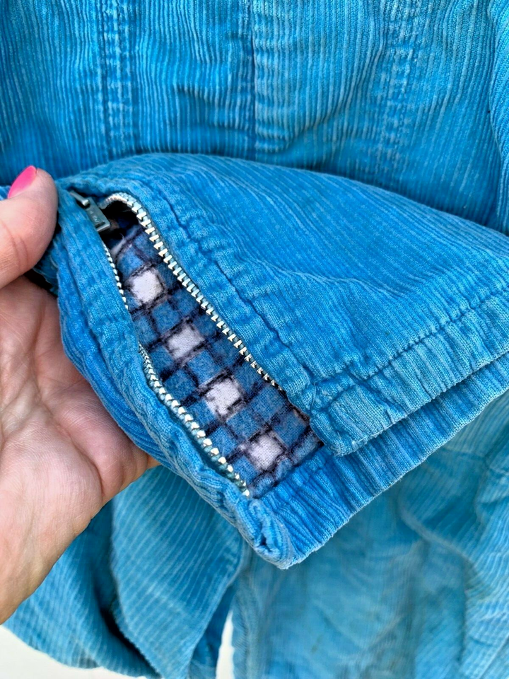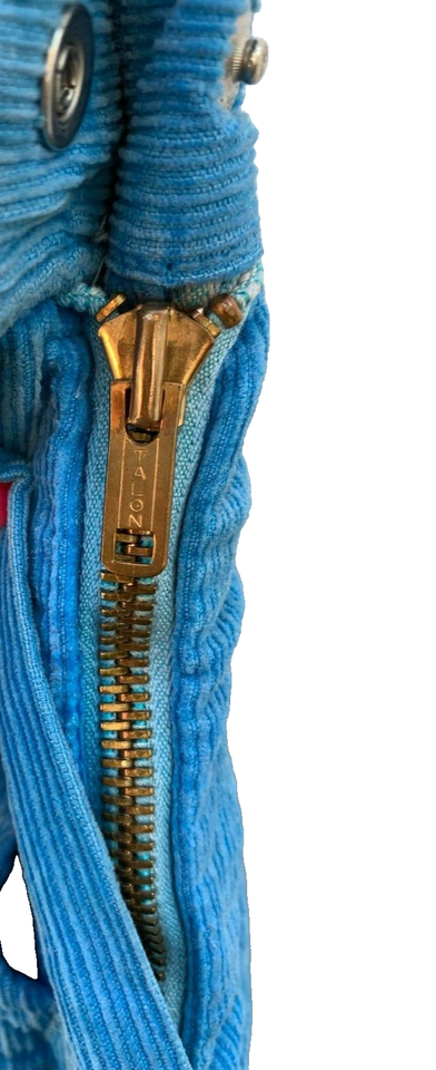 Authentic vintage 1940s?50s women?s/girls? high-waist buckleback pants in turquoise cotton, lined in flannel for warmth. A rare example of midcentury utilitarian fashion with unique details that make them both collectible and wearable.