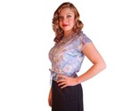Charming vintage 1950s sheer nylon blouse in a soft blue floral print. Features a wide boat neckline, cap sleeves, darted bodice for fit, and a bow-trimmed peplum waist. Back button closure adds to the authentic mid-century styling. The interior is lined in sheer buff nylon, giving the blouse structure and modesty while maintaining its delicate effect.