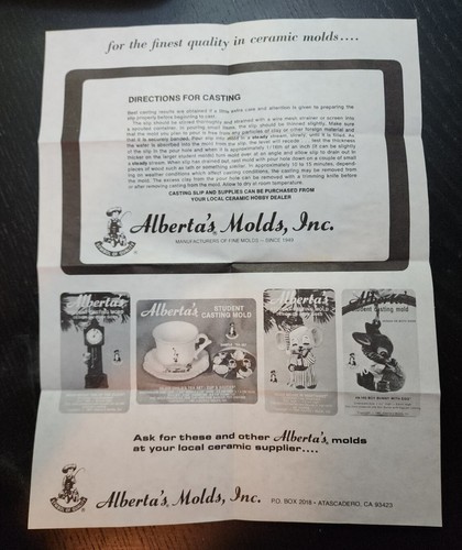 This Alberta's Student Casting Mold comes with original instructions Band and Box. The plaster molds are in Excellent Condition, Some have seen no use and some very minimal use, with minor wear as shown in the photos. The boxes are all in Amazing condition--a couple do have tape on them. From the Estate of an amazing Crafter! PLEASE REFER TO ALL PHOTOS FOR A BETTER VISUAL DESCRIPTION OF THE ITEM All of My Items Come from a Smoke Free Home and have been cleaned unless otherwise noted above I Strive to Ship Next Day Feel Free to Look Through My Other Listings Please contact me with any issues prior to leaving negative/neutral Feedbacks or low detail rating, as I will always do my best to solve any problems that may come up! Please refer to all photos above for a better visual description of the product being offered and it's condition. If you have any further questions, please feel free to message me Any props that are used in the taking of the photos are not included. Only the item/items in the title of the listings are being sold Notice Regarding Vintage Items: I specialize in vintage items that are usually 50+ years old. It is important that you examine this item carefully before bidding. I welcome all the questions. While I try hard to get my description accurate, you must look at the pictures and remember that vintage is NOT new or mint. Unless otherwise stated, items WILL have age related wear. These are usually items that are no longer manufactured or available by retail. I buy at estate auctions, yard sales, and antique stores, and I surface clean most but not all of my items. I try to describe my items the best I can. There is no intentional misleading information in my listings, but there may be a mistake or something missed occasionally due to human error. I do not smoke, however the previous owner(s) might have. If you buy or collect vintage, you must know that the items come from an era when the vast majority of Americans did smoke. Most of my customers want items in their authentic condition, which shows wear and proves age, so I leave any deep cleaning to the buyer's discretion. My items are sold in "as is" condition. I try to highlight any flaws over and above normal wear and tear, but again, you must look at the pictures and please feel free to ask questions