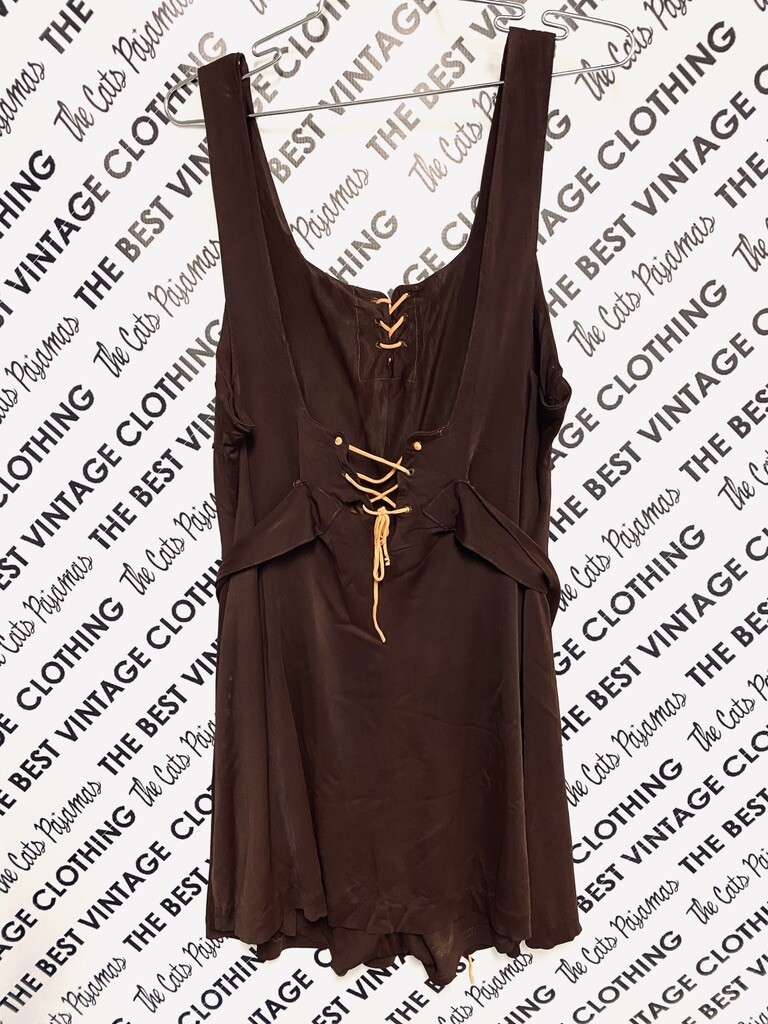 VTG 30s Ocean Sunback Brown Lace One Piece Swimsuit Pleated Skirt Belt L
