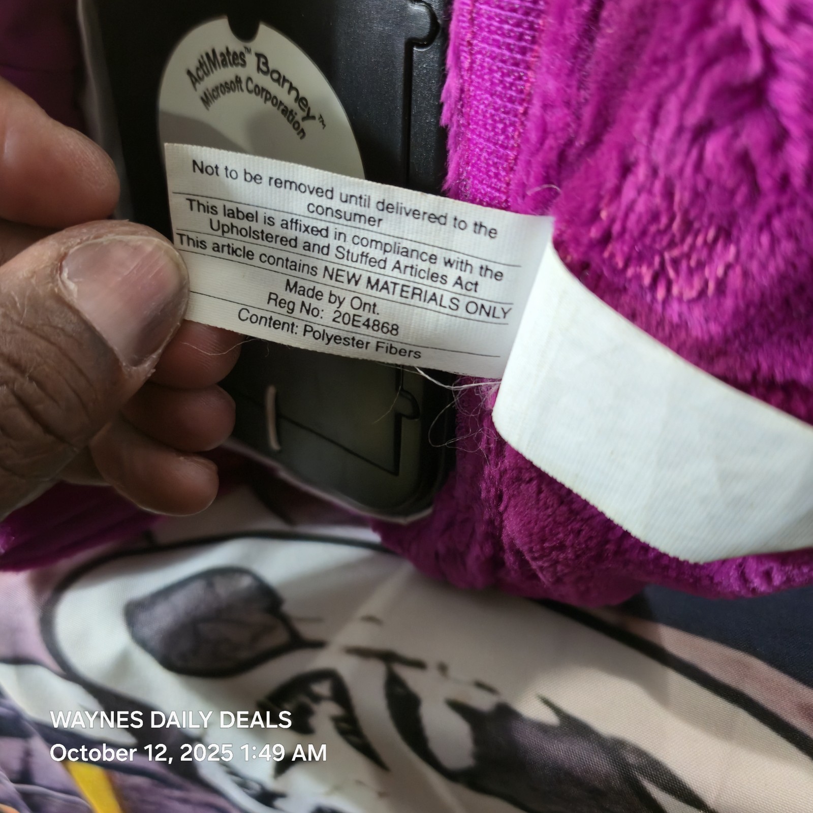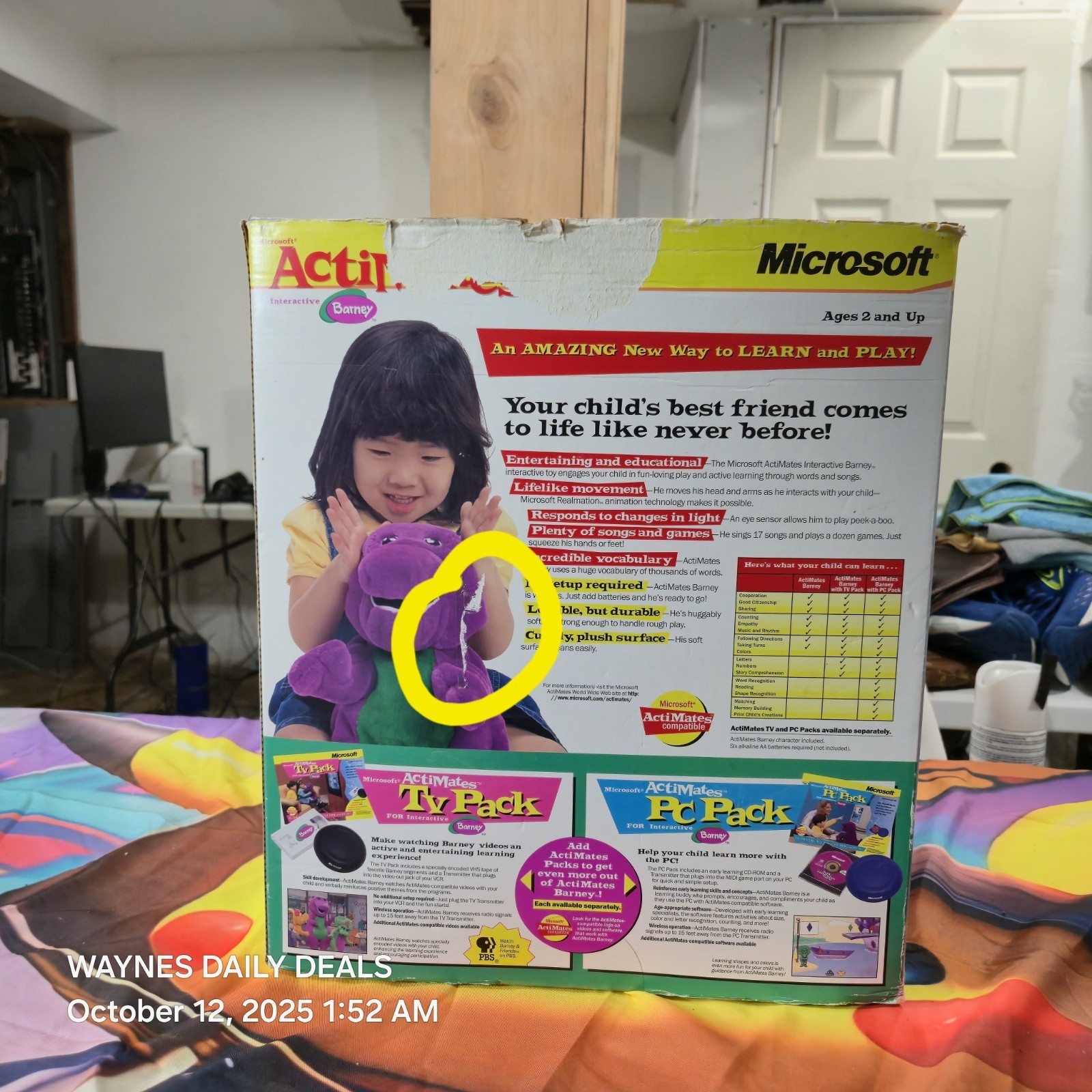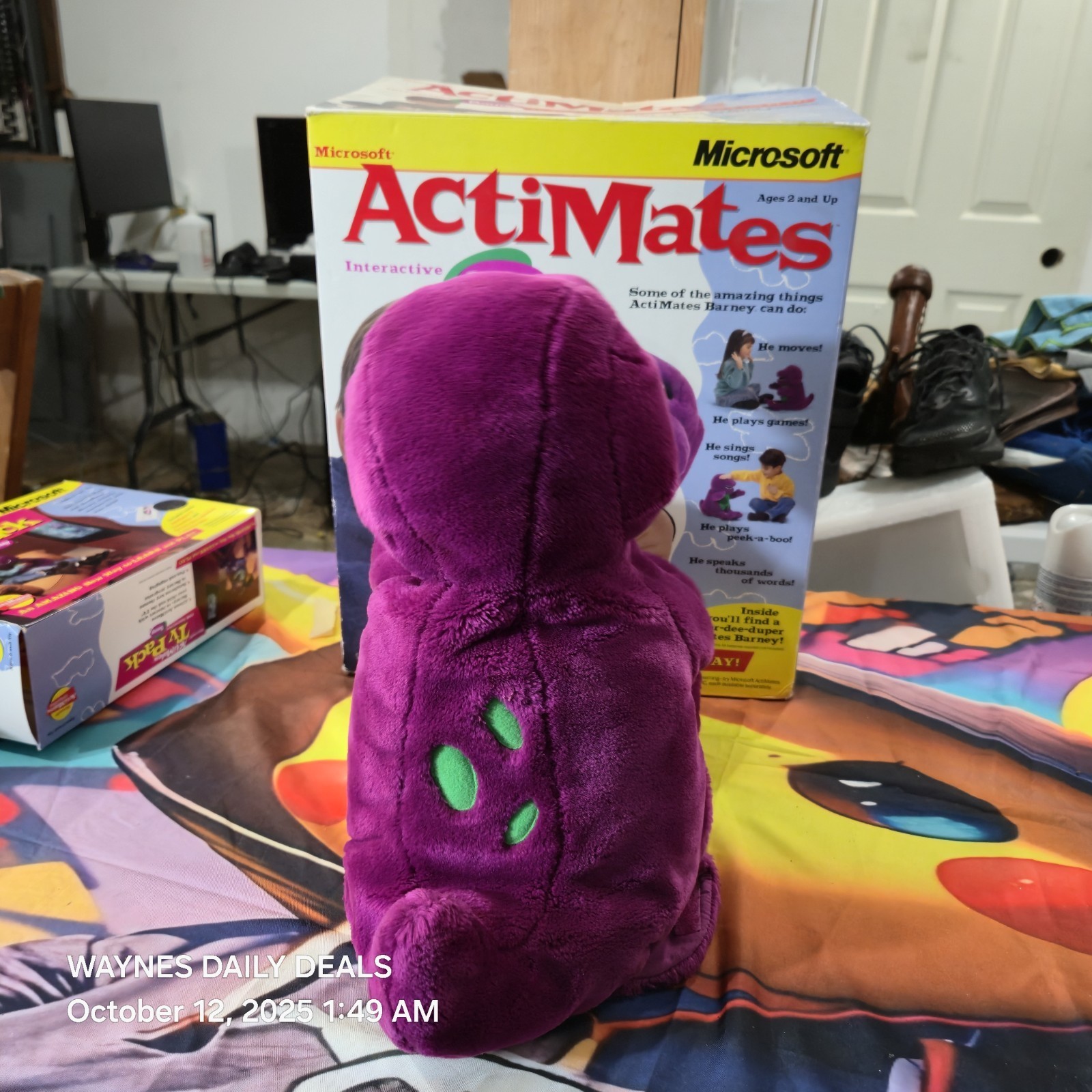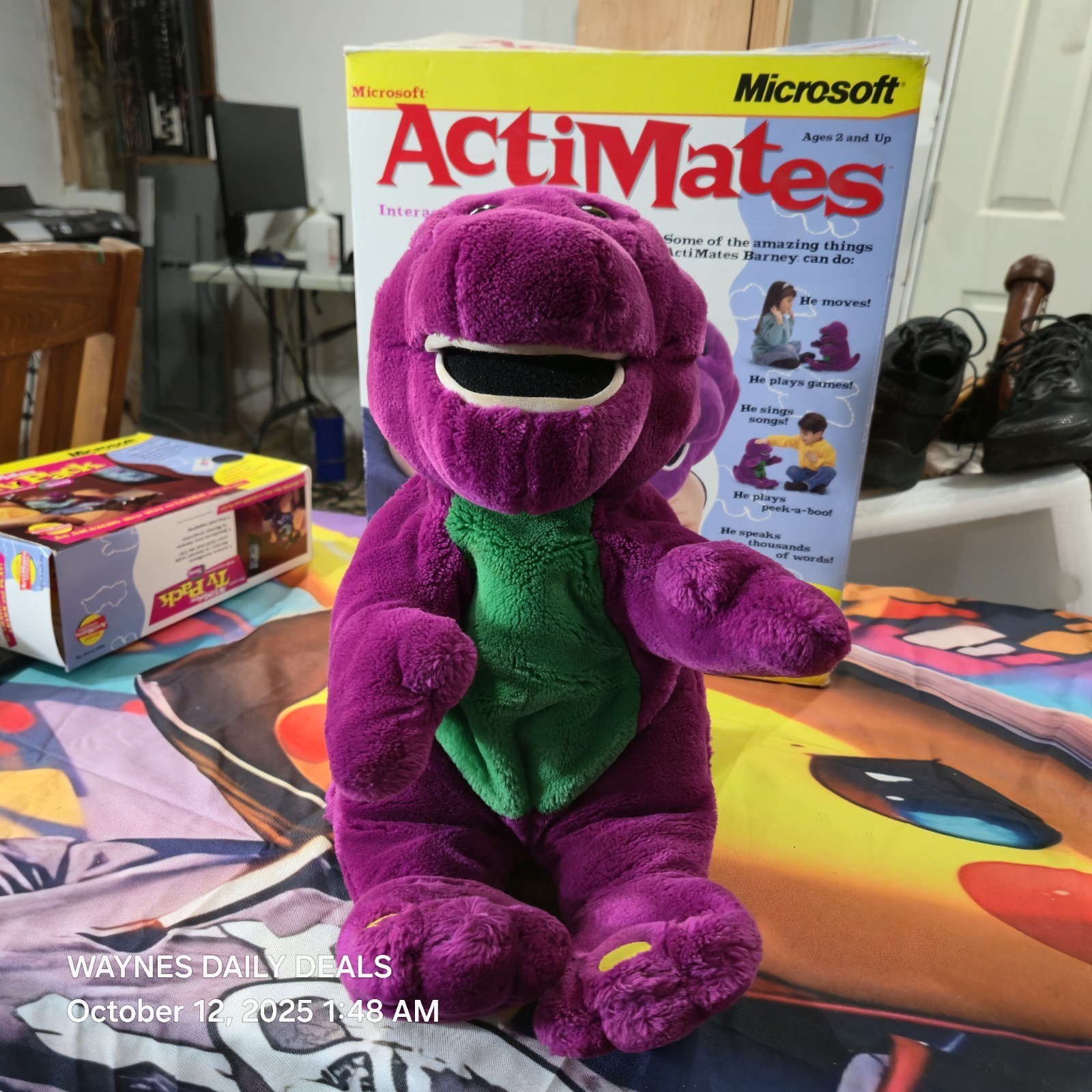 Microsoft?s ActiMates Barney was a groundbreaking interactive toy in the 1990s. He responds to TV shows, VHS tapes, and even PC software (sold separately). Very few survive today in working condition with original packaging.