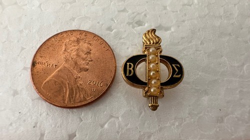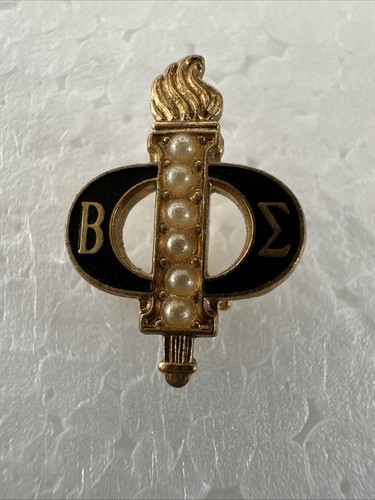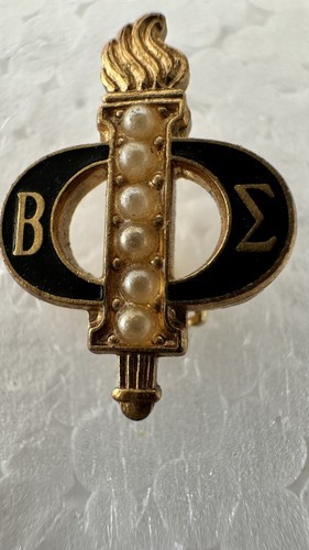 - VTG Beta Sigma Phi Faux Pearl Torch Gold Tone Enamel Sorority Lapel Pin Brooch