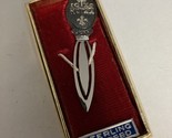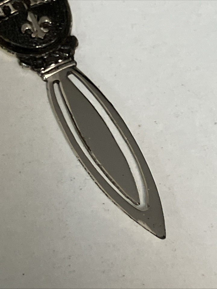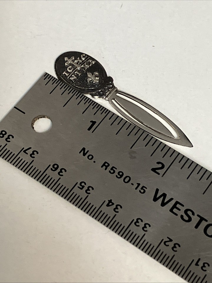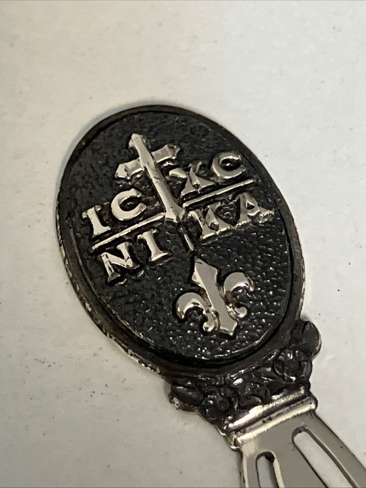 Vintage sterling silver bookmark by Creed in its original box. It features a religious crest with the Greek abbreviation "IC XC NI KA" which stands for "Jesus Christ Conquers" and a fleur-de-lis symbol. Bookmark is 2 inches long. Will ship USPS with tracking to winning buyer