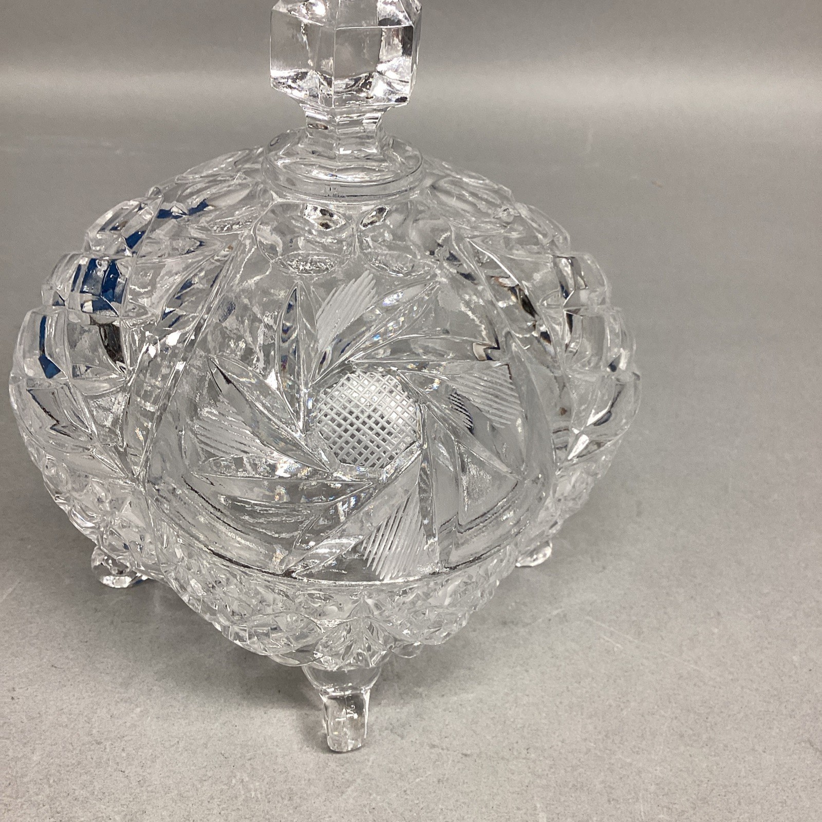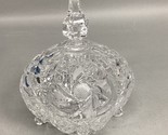 VTG Lead Cut Crystal Covered Candy Dish Spire Pinwheel Footed. In very good condition. The lid measures 6.25?Hx5?D. The base measures 2.75?Hx5.25?D. Together they are 8.75?H