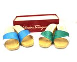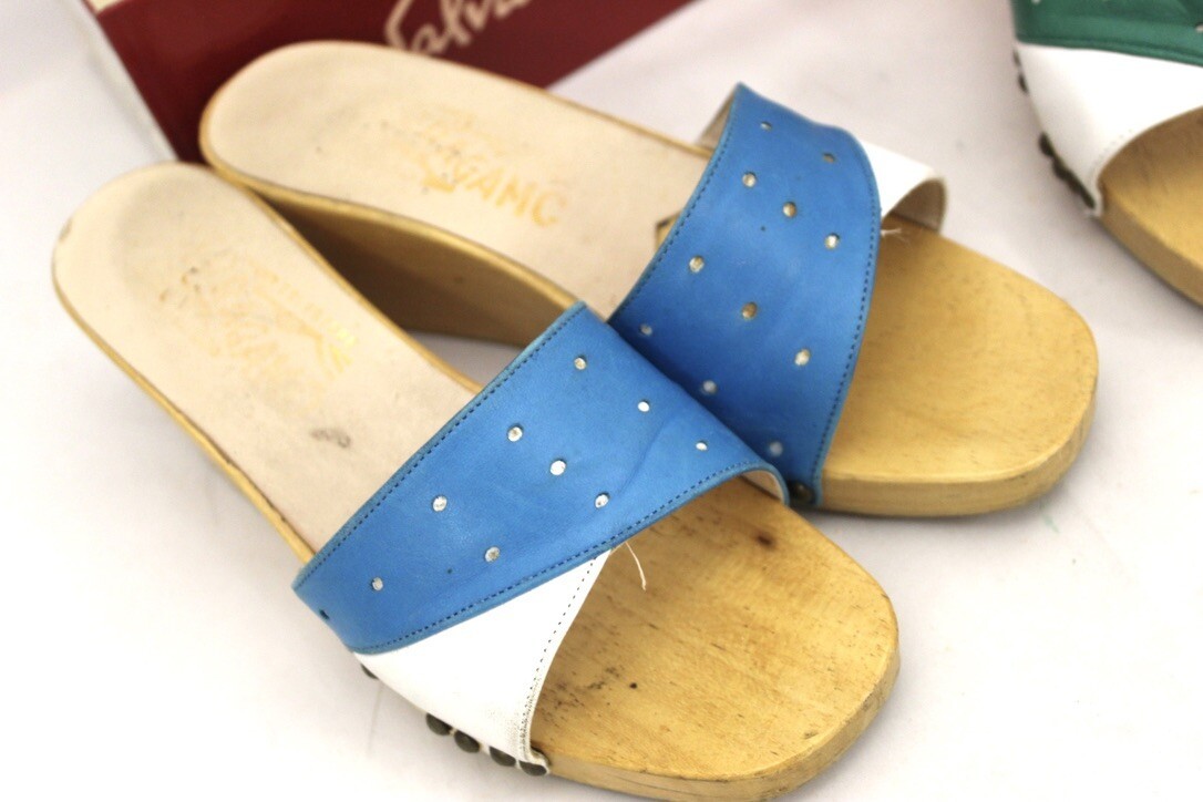 VTG Salvatore Ferragamo Wood Wedge Slide Mule Sandals Sz 5B Made Italy 2PR 80s Colorblock, one green and white, one blue and white. Gripper soles. The uppers are perforated nappa leather( according to the box) and the style is BeBe.