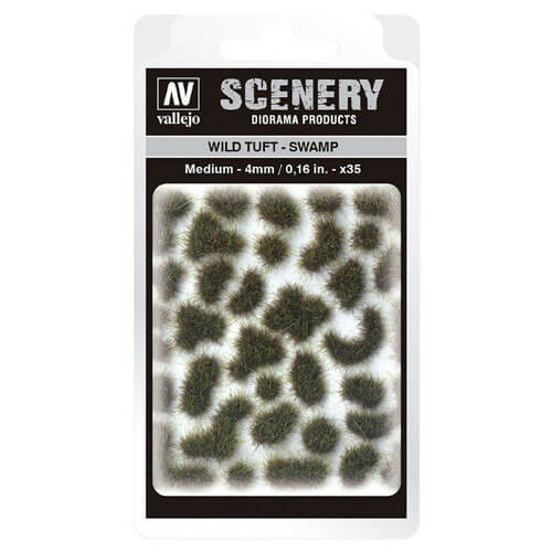 Vallejo Scenery - Wild Tuft - Medium - Swamp. Vallejo Scenery contains a wide range of sizes and references. Ready to use by simply peeling off each tuft individually and placing it in your scene. Self adherent to your base although they can also be fixed with PVA glue to get a tougher and more permanent adherence.