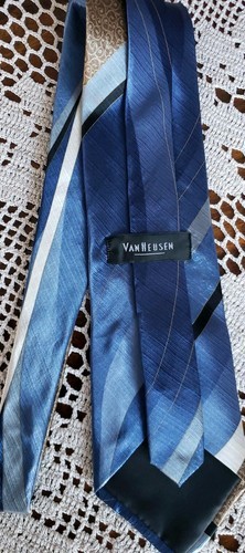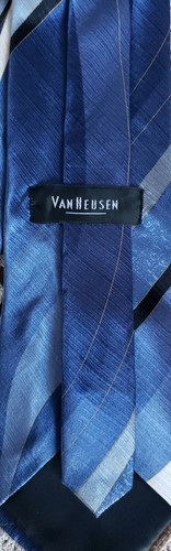 This sale is for one (1) Van Heusen brand necktie 100% Silk Necktie measures approximately 59" long x 4" at widest point Shades of blue ~ brown ~ ivory black throughout Wide necktie Necktie is in very good ~ pre-owned condition Please view photos for a good description of this necktie Thank you!