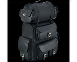 Large full size openings on each side allowing easy access to inside cargo even when the bag is still mounted on the motorcycle. Main side doors include 2 inside mesh pockets and one outside pocket. Spacious interior with adjustable shelf. Fully adjustable mounting rig easily attaches to any sissy bar. Hard lined construction maintains the bags shape. Top roll bag for extra cargo capacity with shoulder strap and cargo straps that can mount the roll bag or strap down extra gear; jacket, rain gear, sweatshirt, etc. Top carrying handle, detachable back pack straps and shoulder strap for easy toting. Constructed of a heavy, durable denier nylon heavy thread that is UV protected, water-weather resistant and made to last! Accented with leather look panels. Rain cover with security tether included.