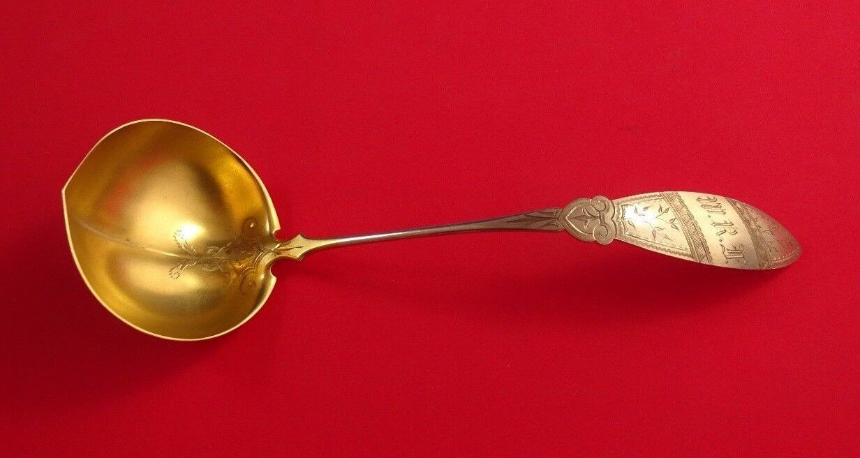 Vanderslice coin silver Soup Ladle Gold Washed Bright-Cut, 12 3/4". It is monogrammed (monos vary) and is in excellent condition. Beautiful!