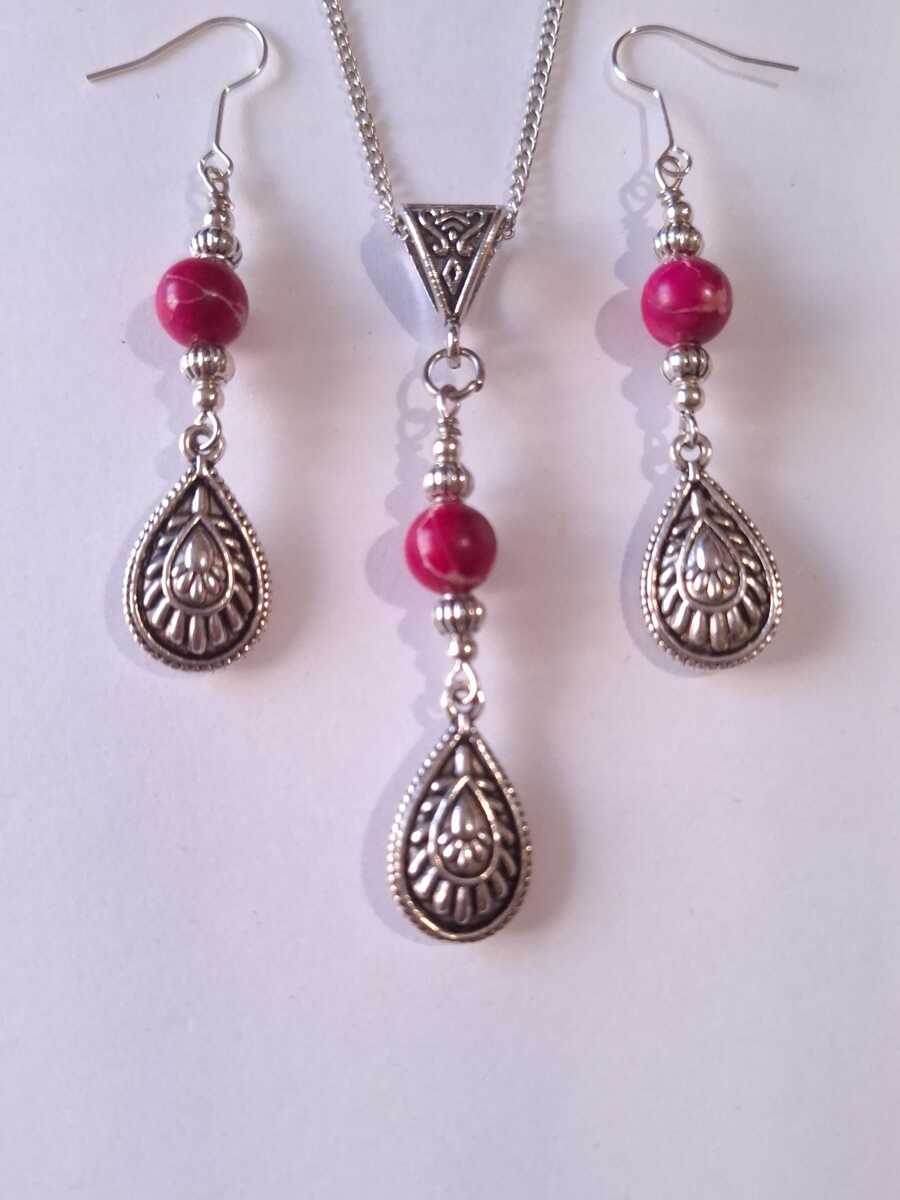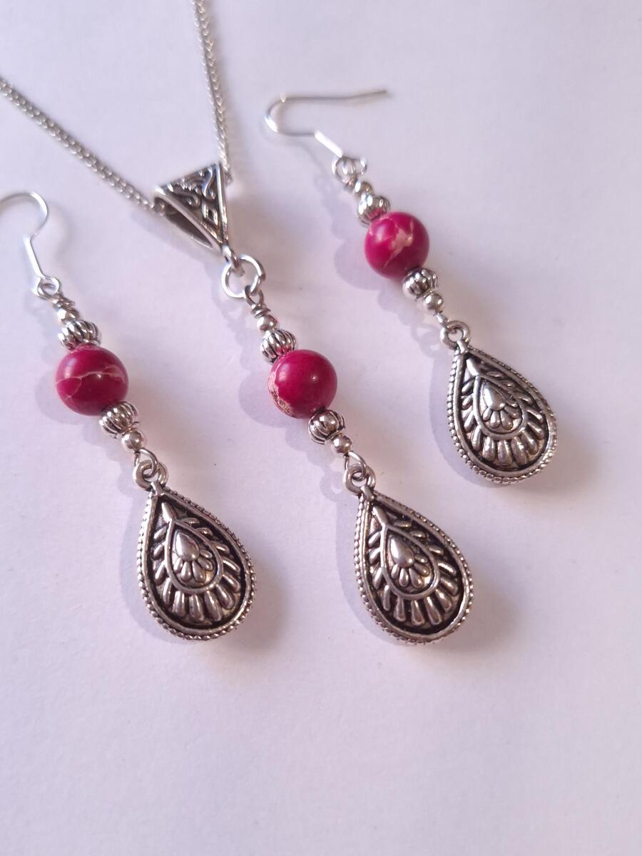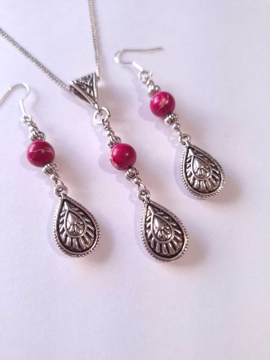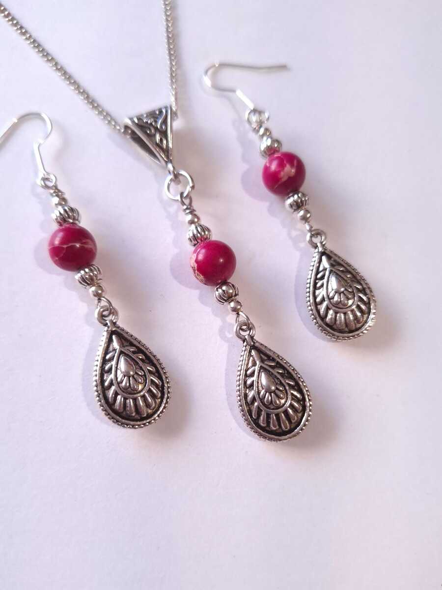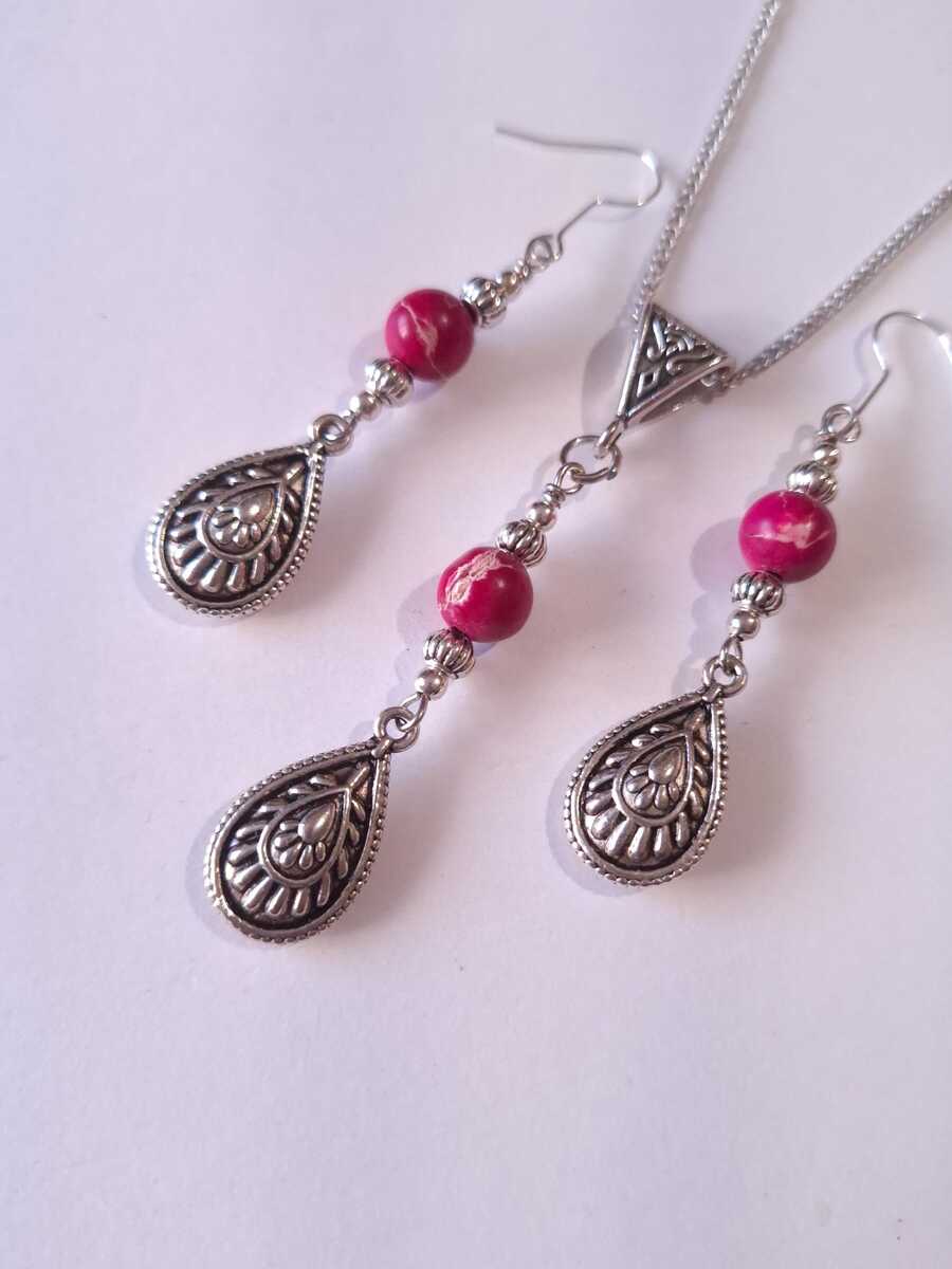 Variscite silver Victorian jewelry set pink fuchsia silver Variscite set earrings necklace Bohemian set Variscite earrings boho jewelry set gift magenta