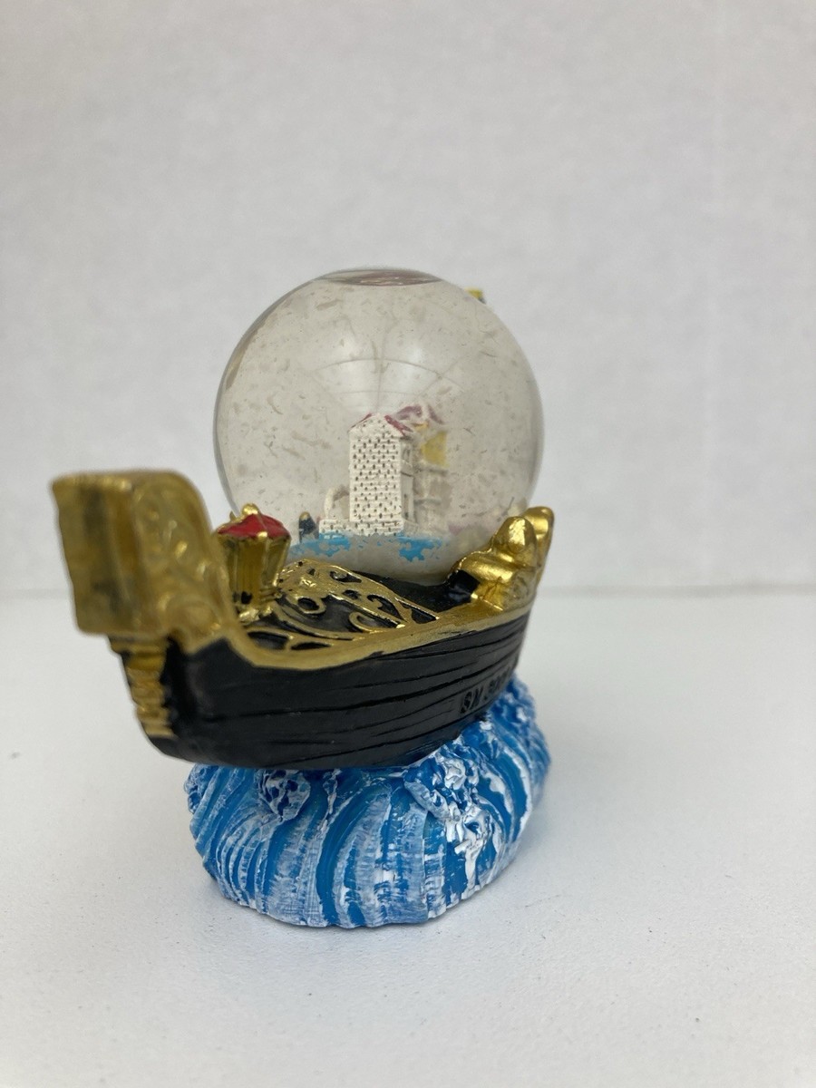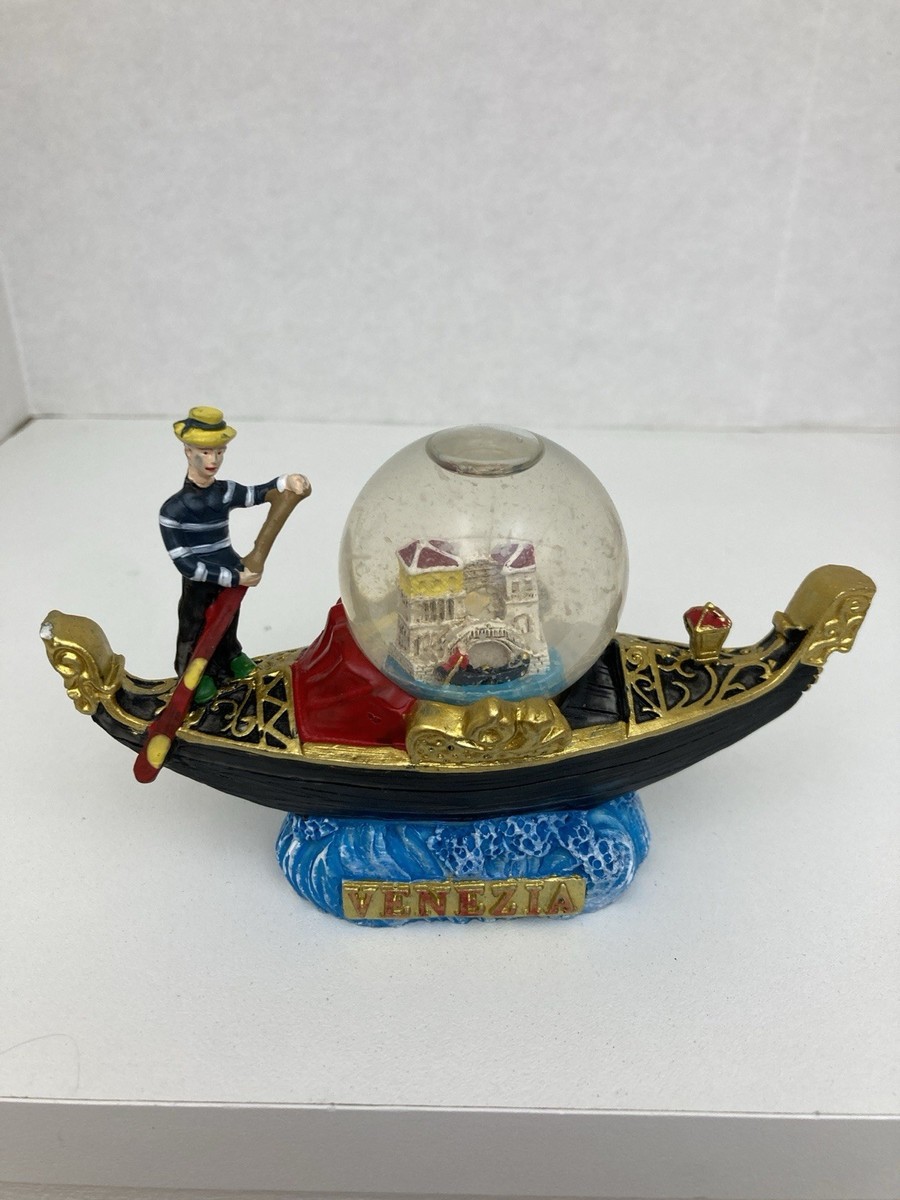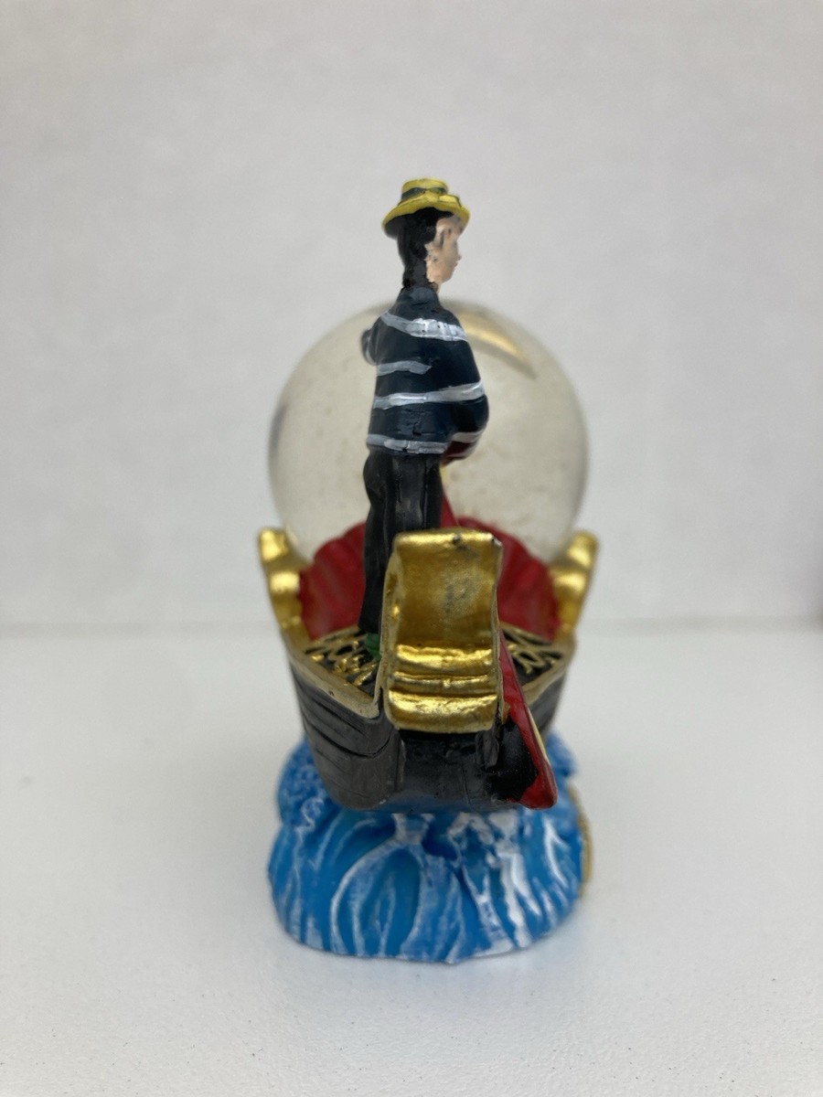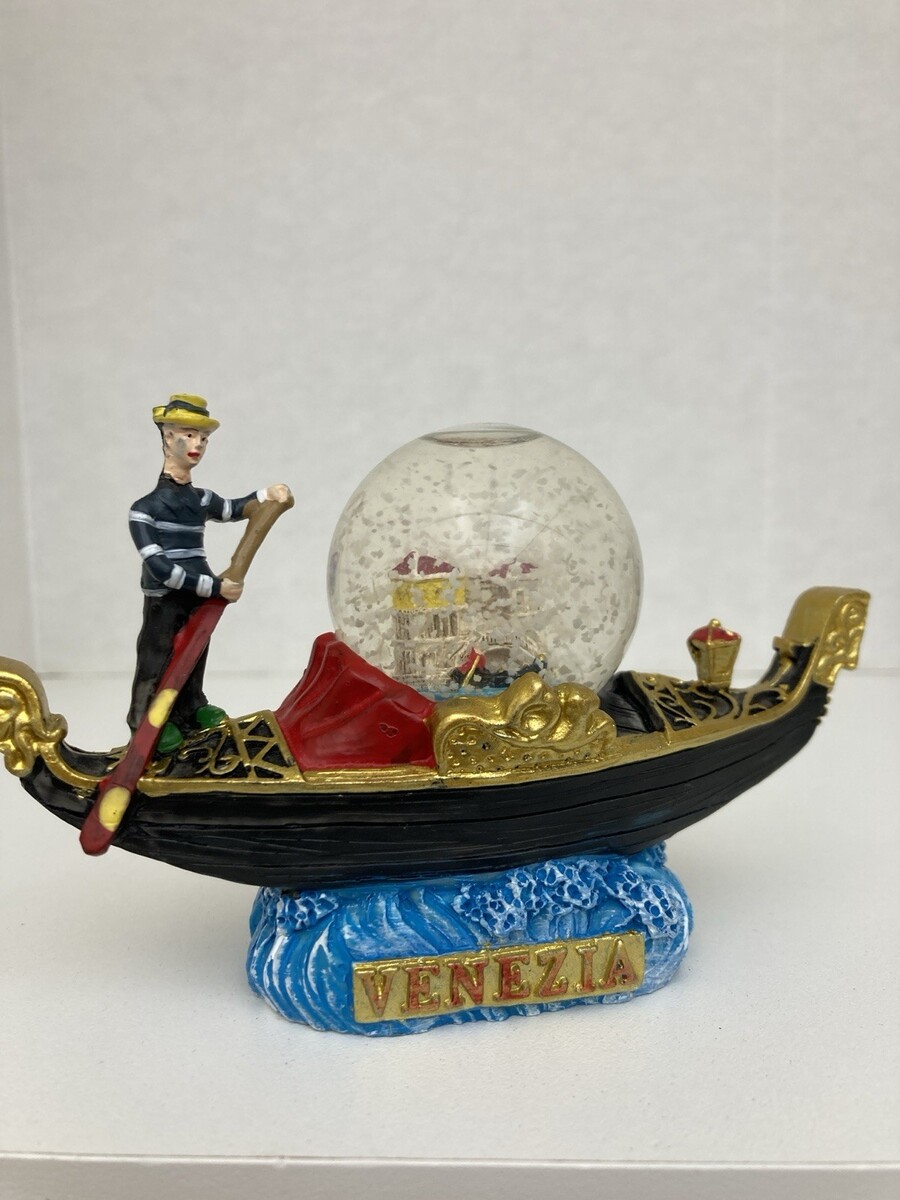 The Venice Gondola Snow Globe is a charming collectible featuring a gondola and gondolier design. This contemporary snow globe showcases a picturesque scene of a gondola in the iconic Venice canals, creating a whimsical and enchanting display for travel collectors. The intricate details and delicate craftsmanship make this item highly collectible. Please: theres a bubble and water is a bit cloudy 5 x 3 x 2 in
