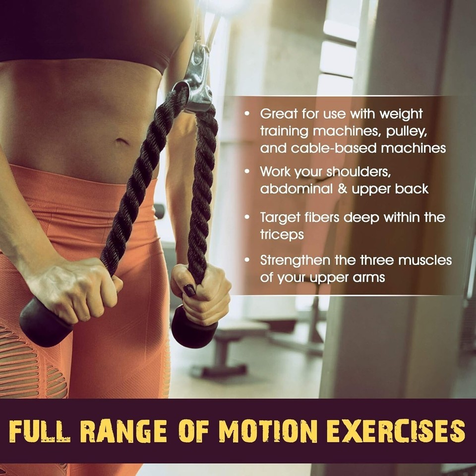 The Tricep Rope is constructed from heavy-duty black nylon braided rope, designed relentlessly to endure heavy use.