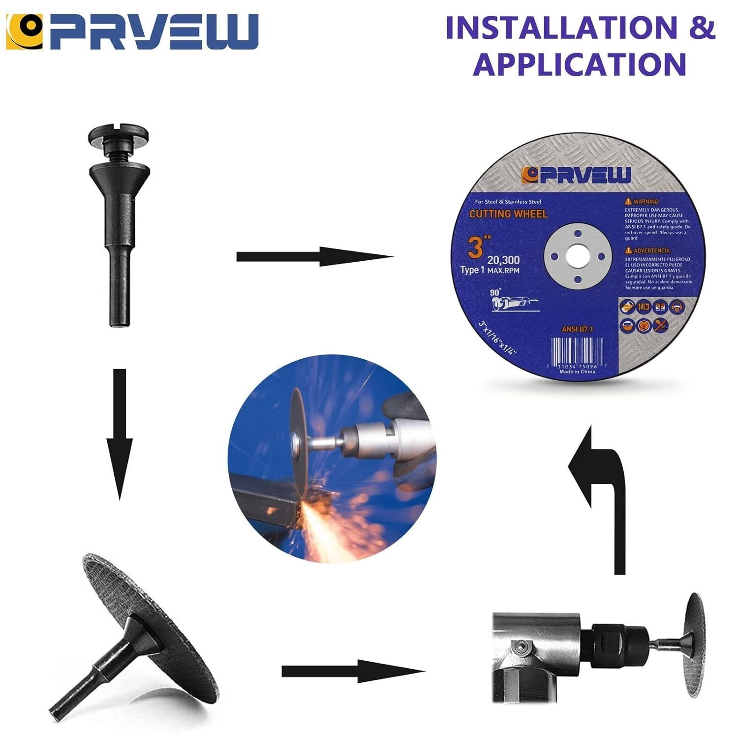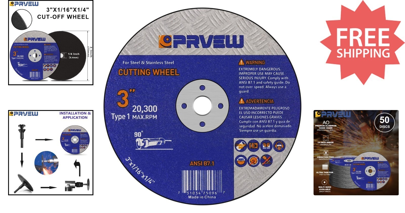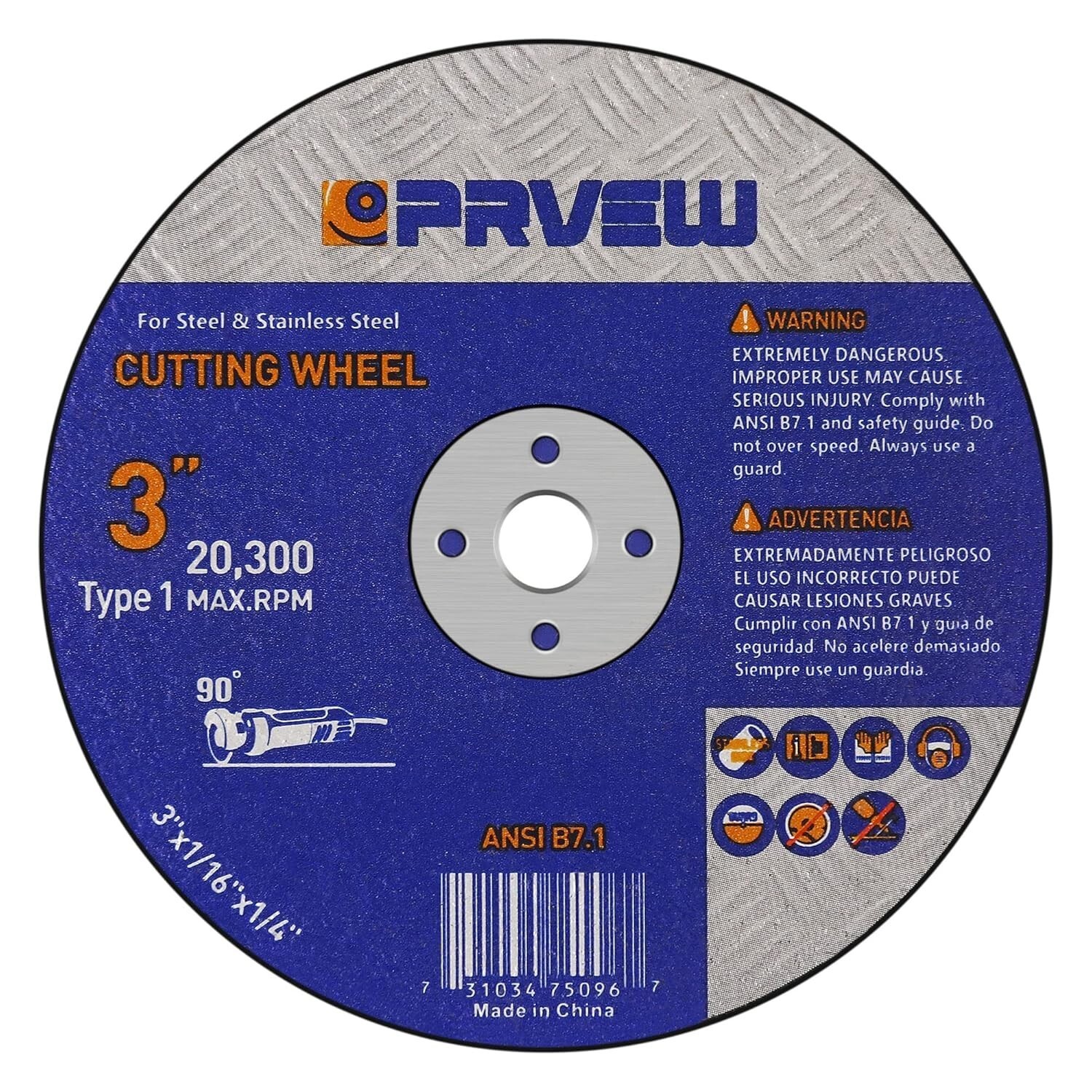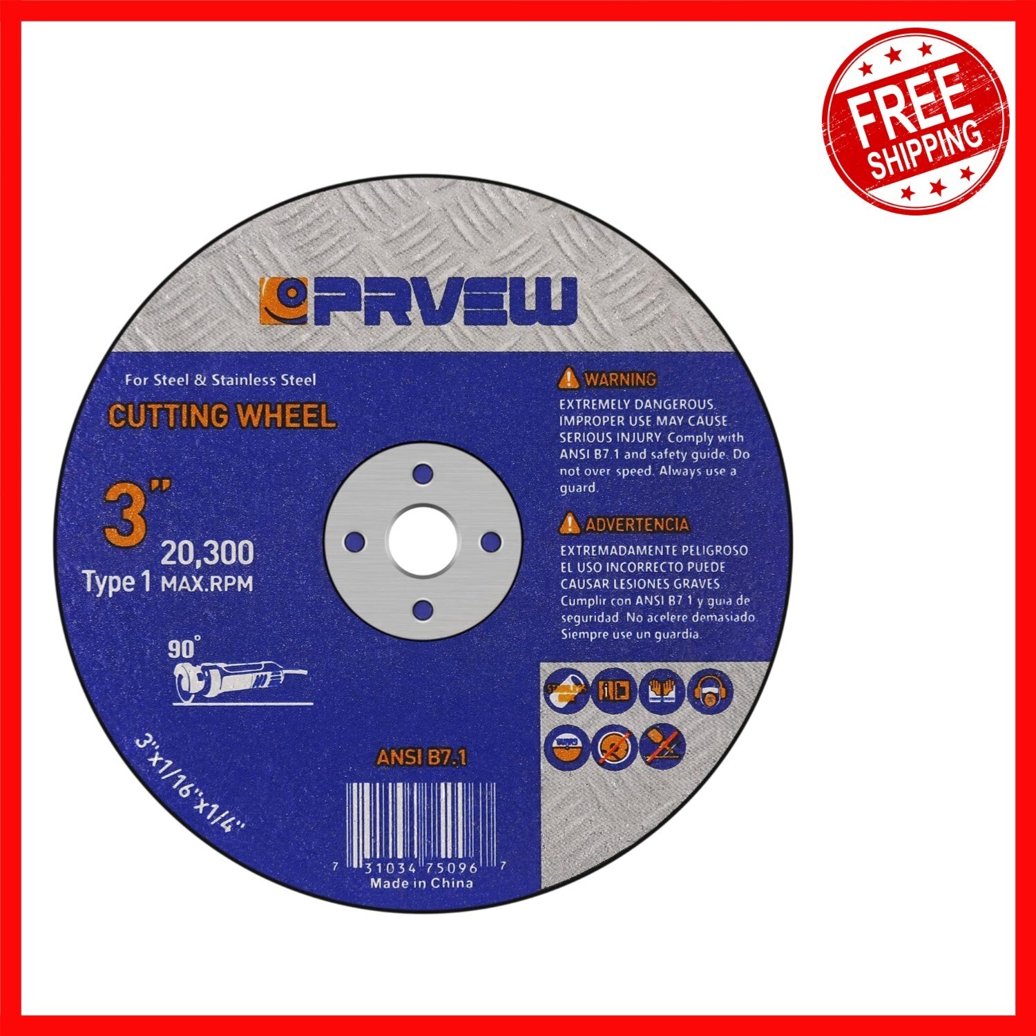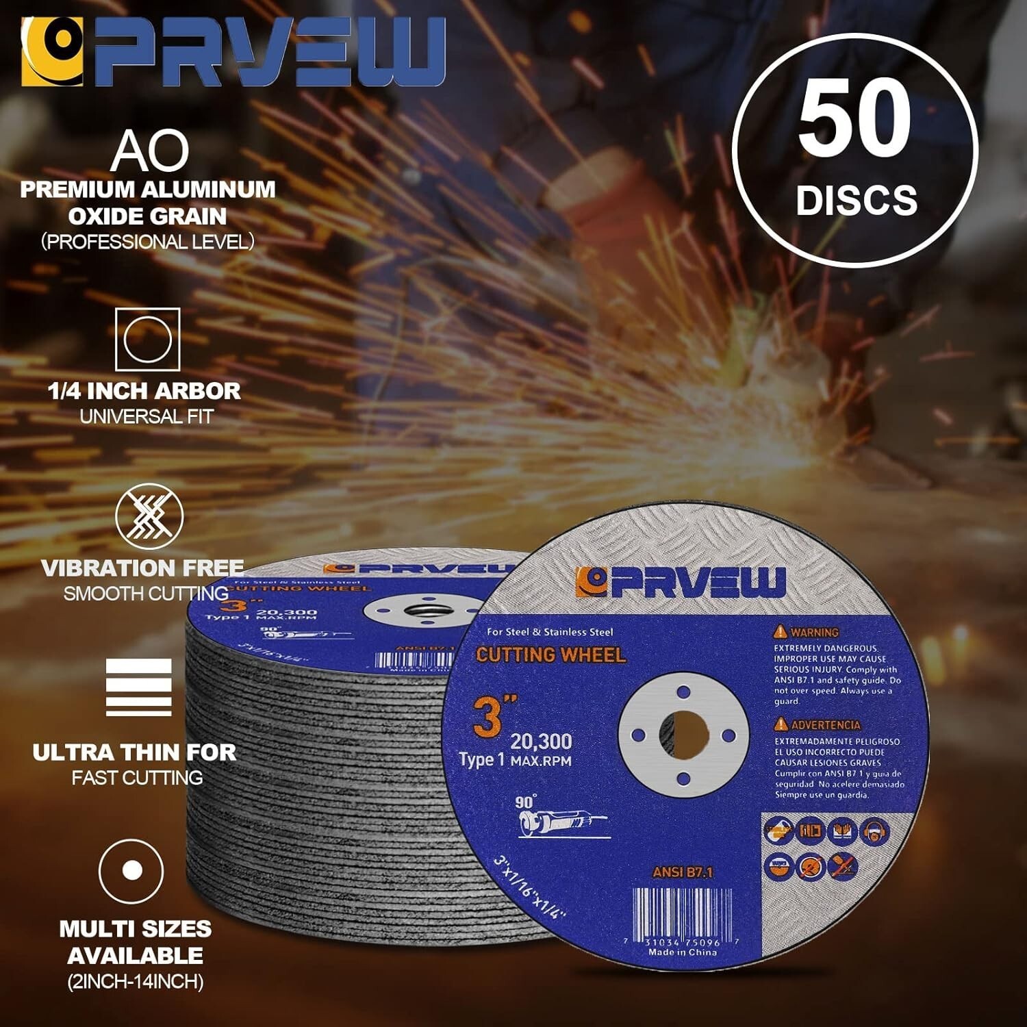 The PRVEW 3-inch Cutting Off Wheel is designed for precision and safety, compatible with all 3" portable die and angle grinders with a 1/4" arbor. Crafted with reinforced double fiberglass mesh and aluminum oxide grain, it guarantees durability, aggressive cutting action, and long-lasting performance. Its 1/16 inch thickness ensures fast, clean, and precise cuts with minimal burrs and waste. Versatile and reliable, it's ideal for cutting carbon steel, stainless steel, iron, copper, and other ferrous metals using die grinders, air cut-off tools, or electric cut-off tools. Elevate your grinding tasks with confidence and efficiency.
