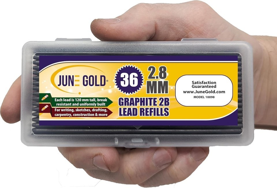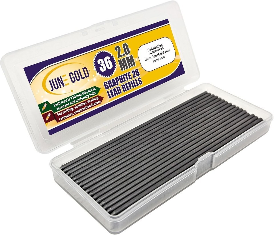 36 graphite lead refills with a 2.8 mm diameter, 2B hardness, and 120 mm in length (4.72 in).