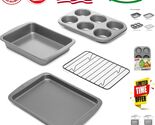 Set Includes: 8.5" x 6.5" Cake Pan, 8.5" x 6.5" Cookie Sheet, 10.25" x 7" 6-Cup Muffin Pan and 7.5" x 5.5" Cooling Rack.