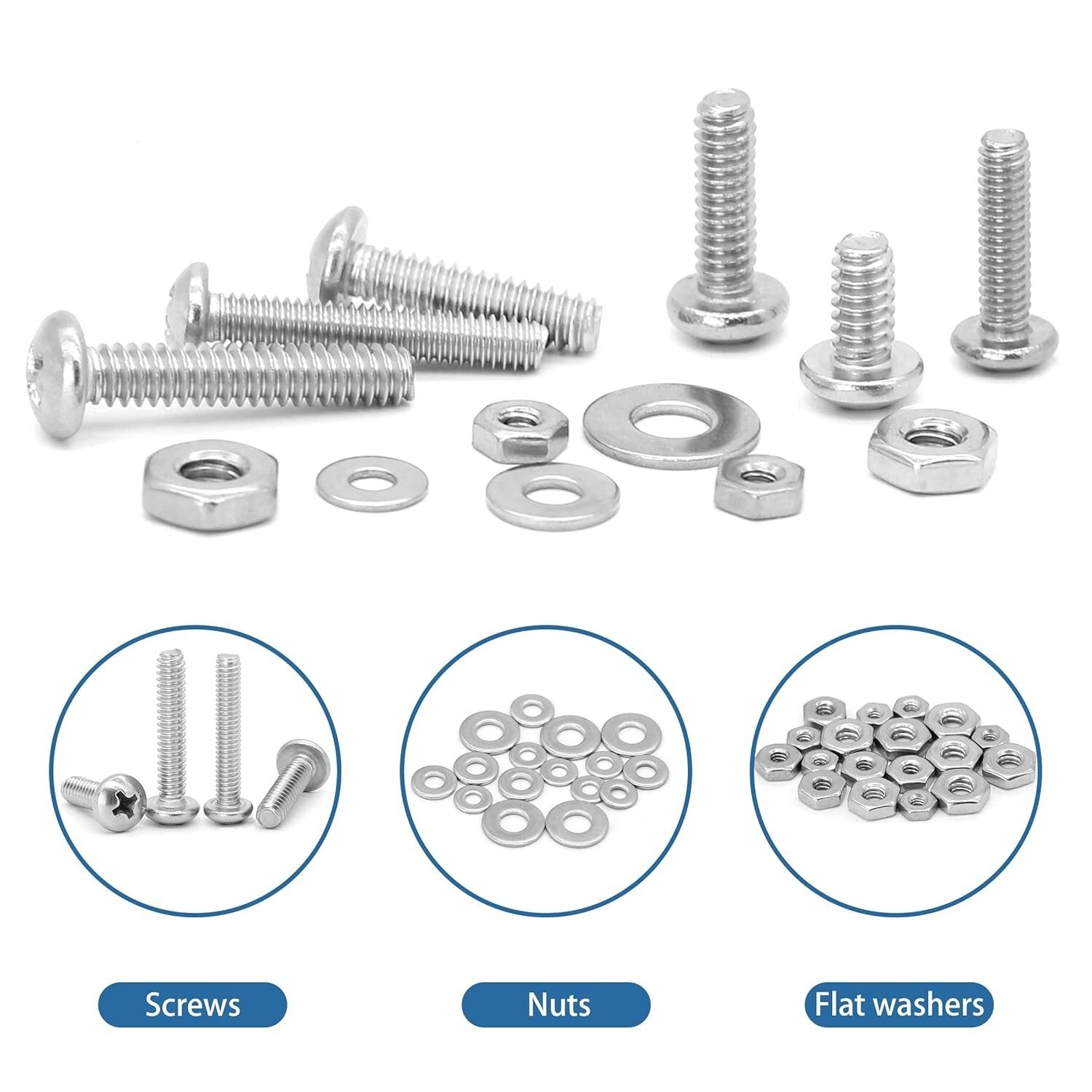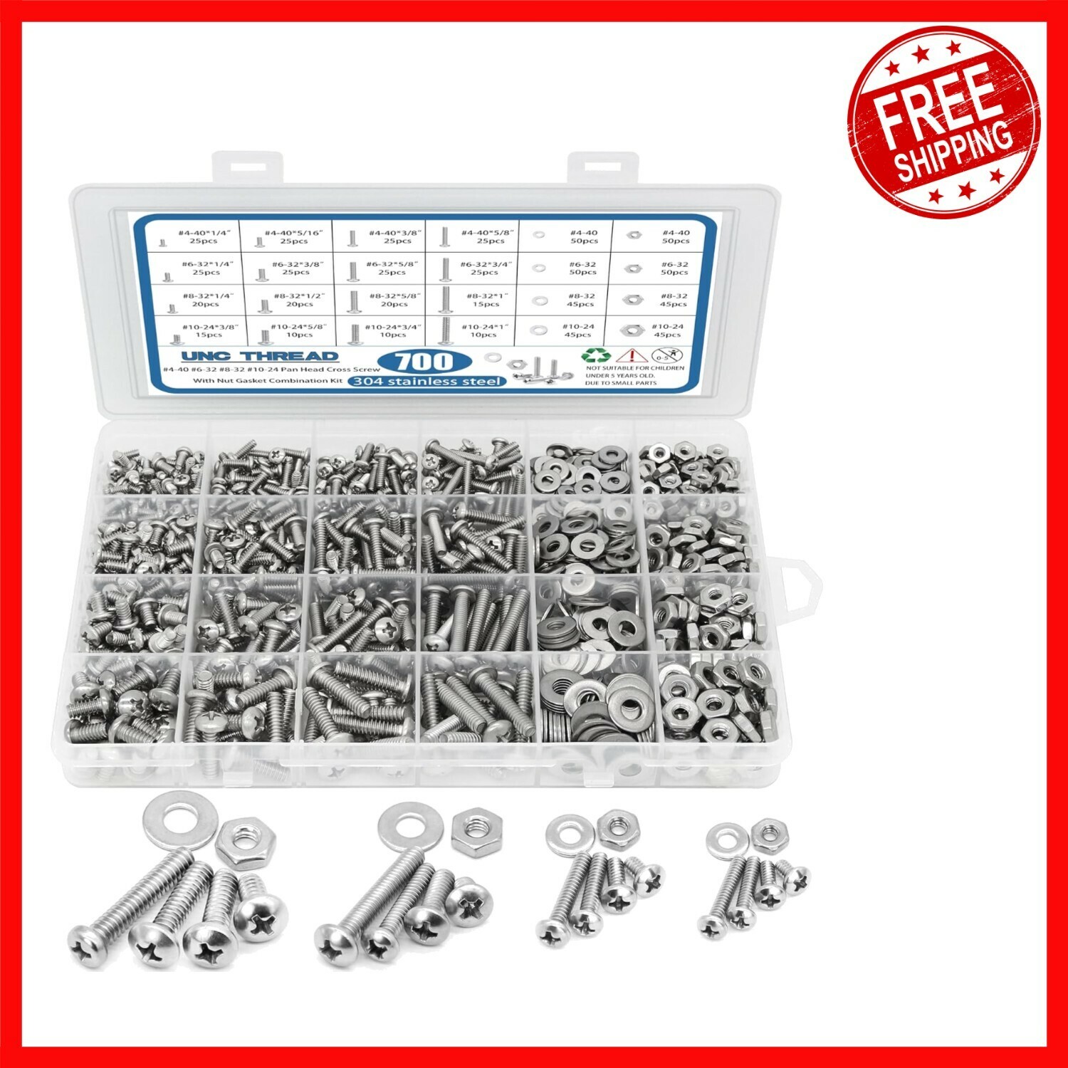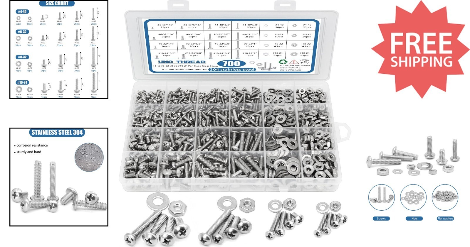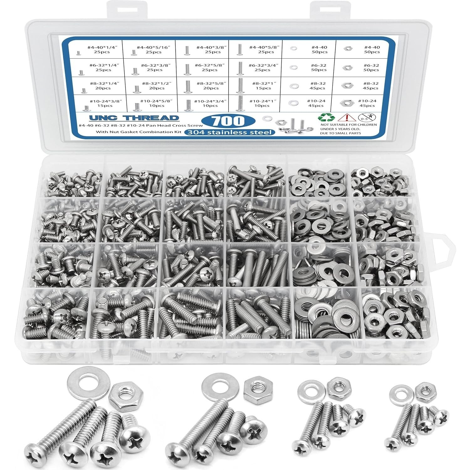 This Stainless Steel Bolts and Nuts Kit is your versatile fastening solution, featuring assorted stainless steel 304 components that are waterproof and corrosion-resistant. Includes a comprehensive range of sizes (#4, 6, 8, 10, 16) with ample quantities of pan head screws, Phillips screws, washers, and nuts. Packaged in a convenient see-through box with an detailed size information sheet for easy storage and quick access. Ideal for various household applications and a perfect gift for any DIY enthusiast. Backed by a 24- , ensuring your satisfaction and peace of mind.