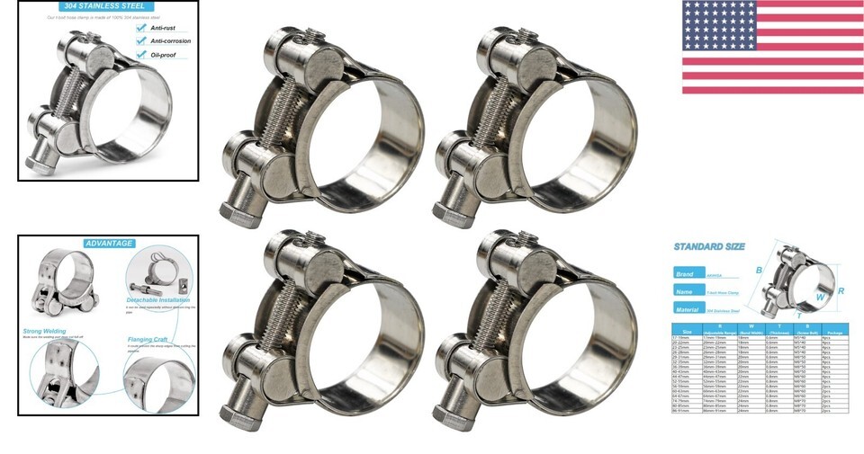 - Versatile T-Bolt Hose Clamps 32-35mm, Stainless Steel Adjustable - 4 Pack