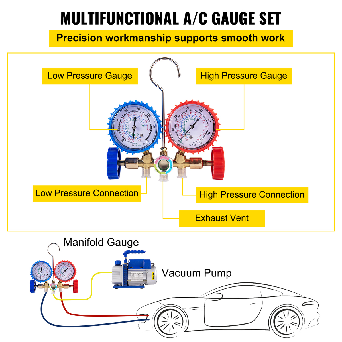 Complete Refrigerant Tool Kit: This tool kit has complete accessories, including a one stage rotary vane vacuum pump, a manifold gauge, three color-coated hose. There is a carrying case for gauge, hoses, and other accessories, so you can organize them and carry them easily. A professional refrigerant tool kit facilitates your maintain work.
