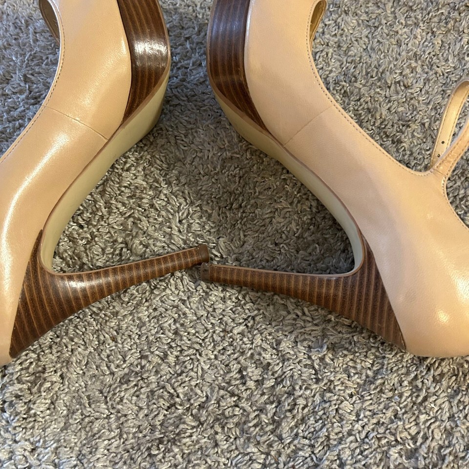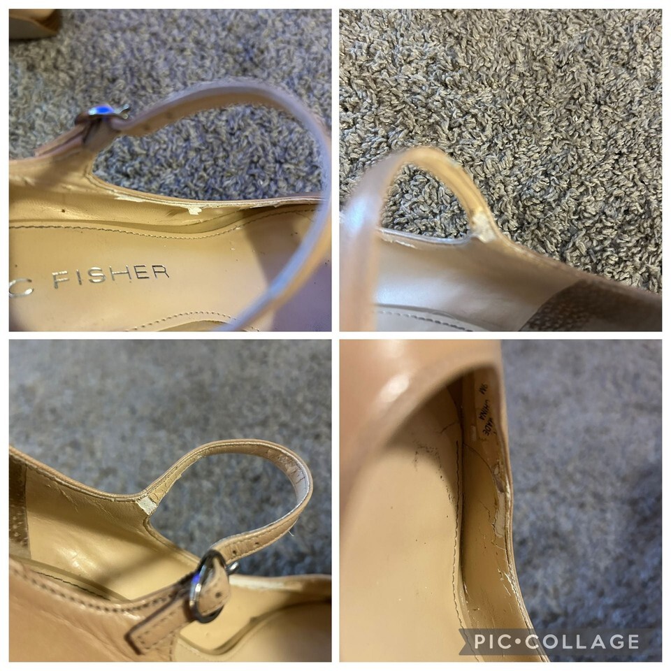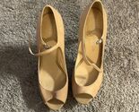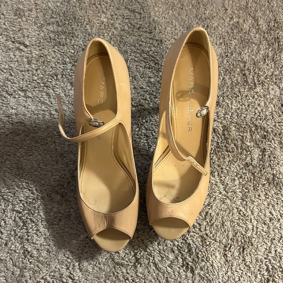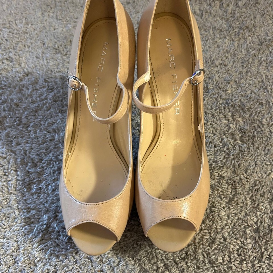 Step out in style with these elegant Marc Fisher nude peep-toe heels. Featuring a sleek patent leather finish and a delicate ankle strap, these heels are perfect for any occasion, from office wear to evening events. The nude color ensures versatility, pairing effortlessly with a wide range of outfits. These shoes are in good, used condition with normal wear consistent with their age and use. Photos show some minor scuffing on the patent leather and slight discoloration on the insoles, which are typical signs of wear but do not detract from the overall appeal. No major flaws or damage. Grab these stylish and comfortable heels to elevate your wardrobe!