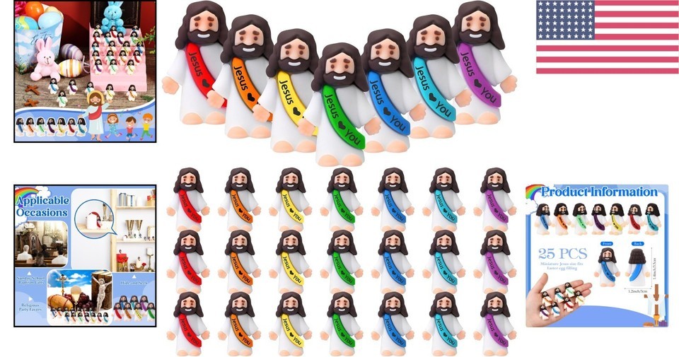 Vibrant Rainbow Jesus Figures ? 25 Pcs Mini Toys for Fun Religious Activities ? ? ? ? ? ? ? ? ? ? ? ? ? ? ? ? Vibrant Rainbow Jesus Figures ? 25 Pcs Mini Toys for Fun Religious Activities Experience joy and brightness with our delightful set of 25 miniature Jesus figurines, each crafted to inspire and uplift. Available in 7 vibrant colors reminiscent of the rainbow?red, orange, yellow, green, blue, indigo, and purple?these charming figures measure approximately 1.2 x 1.4 inches (3 x 3.5 cm), making them perfect for sharing or collecting. Product Features: Sufficient Colors and Styles: 25 miniature Jesus figurines in 7 vibrant colors. Reliable and Versatile: Made from durable, smooth rubber; resistant to fading and tough enough to withstand accidental falls. Small Jesus Figure Gifts: Share these adorable figures as pocket-sized gifts or meaningful keepsakes. Perfect for Religious Activities: Ideal for use in Easter egg hunts, church events, and school activities. Safety Notice: Not suitable for children under three due to small parts; please keep out of their . Wide Ranging Use: Perfect for decorating churches, schools, or any gathering; spreads joy wherever they're placed. Benefits: Brighten your religious gatherings with these vibrant figures. Encourage sharing and community spirit among participants. Add a cheerful touch to any decor or event. Sturdy design ensures longevity and repeated use. Why Choose Our Vibrant Rainbow Jesus Figures? Bring joy and a sense of community to your religious celebrations with our Vibrant Rainbow Jesus Figures. These charming and colorful miniature toys are more than just decorations; they serve as reminders of faith, love, and togetherness. Perfect for sharing with friends, family, or congregation members, they are designed to inspire happiness and foster connections. Whether used for decorating, gifting, or during religious activities, our mini Jesus figures are the ultimate accents for any event. Get your set of 25 today and let the spirit of joy shine bright! Shipping Free Fast Shipping - We offer free shipping to most of the USA with a normal delivery time of 3-7 days. However, due to the current situation, additional delivery time (up to 3 weeks) may be required for some items. Alternative Carriers - We may use alternative carriers (e.g. USPS, FedEx, UPS, etc.) to ensure your package arrives safely and on time. Due to the use of multiple carriers, we are unable to provide a tracking number automatically. Handling Time - Orders are processed and shipped within 1-2 business days of receiving cleared payment. Shipping Restrictions - Shipping to Alaska, Hawaii, Puerto Rico, Guam, and other US territories may incur shipping charges or delivery restrictions. Please contact us before ordering, or your order can be refunded/cancelled. State Restrictions - There may be restrictions based on your state of purchase. For example, certain items may not be shipped to California due to state regulations. Contact for Tracking Updates - If you require tracking updates or have any concerns about the delivery of your order, please feel free to contact us, and we will be happy to assist you. Return 30-Day Hassle-Free Returns - We want you to be completely satisfied with your purchase. If you are not, you can return the item within 30 days of receiving it for a full refund or exchange. Easy Return Process - To start a return, simply contact us and we will provide you with a prepaid return shipping label and detailed instructions. Restocking Fee - There are no restocking fees for returns. However, the buyer is responsible for return shipping costs if the return is not due to a seller's error. Refund Processing Time - Refunds will be processed within 5 business days of receiving the returned item in its condition. Payment We accept all major credit cards, PayPal, and Apple Pay for your convenience. Your payment information is secure and encrypted to ensure a safe and seamless transaction. Please complete your payment within 3 days of purchase to avoid any delays in shipping. Feedback Your feedback is extremely important to us. We strive to provide the best products and customer service possible. If you are satisfied with your purchase, please take a moment to leave us a positive review. If you have any concerns or issues with your order, please contact us before leaving negative feedback. We are committed to resolving any problems and ensuring your satisfaction. Contact Us If you have any questions or concerns, please feel free to out to our customer support team. You can contact us through the messaging system. We are available Monday to Friday, 9:00 am to 5:00 pm EST, and we will do our best to respond to your inquiry within 24 hours. Buy it now and enjoy a pleasant shopping experience! Unit Quantity: 25 Country/Region of Manufacture: Jesus mini figures Figure: Jesus Material: Rubber Religion: Christianity Unit Type: Unit