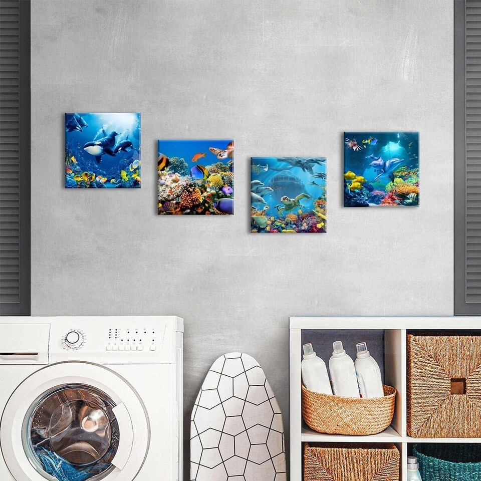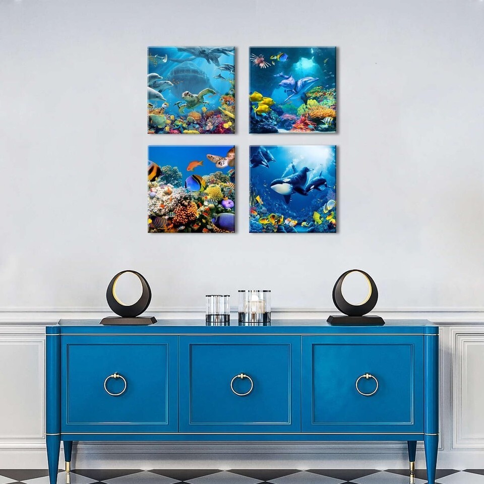 - Vibrant Sea Life 4-Piece Wall Decor Set - Ocean Animal Prints for Home, 12x12”