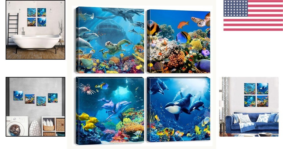 Design: Featuring a tranquil undersea scene, these artworks showcase vibrant marine life including a sea turtle, octopus, seahorse, jellyfish, and more amid colorful coral.