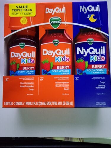 You are Buying a brand New And Factory Sealed Vicks DayQuil NyQuil Kids Cold Cough Liquid, Berry, 8 Fluid Ounce (3 Count).... DayQuil and NyQuil Kids Cold Cough Liquid value triple pack includes 2 day + 1 night.