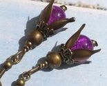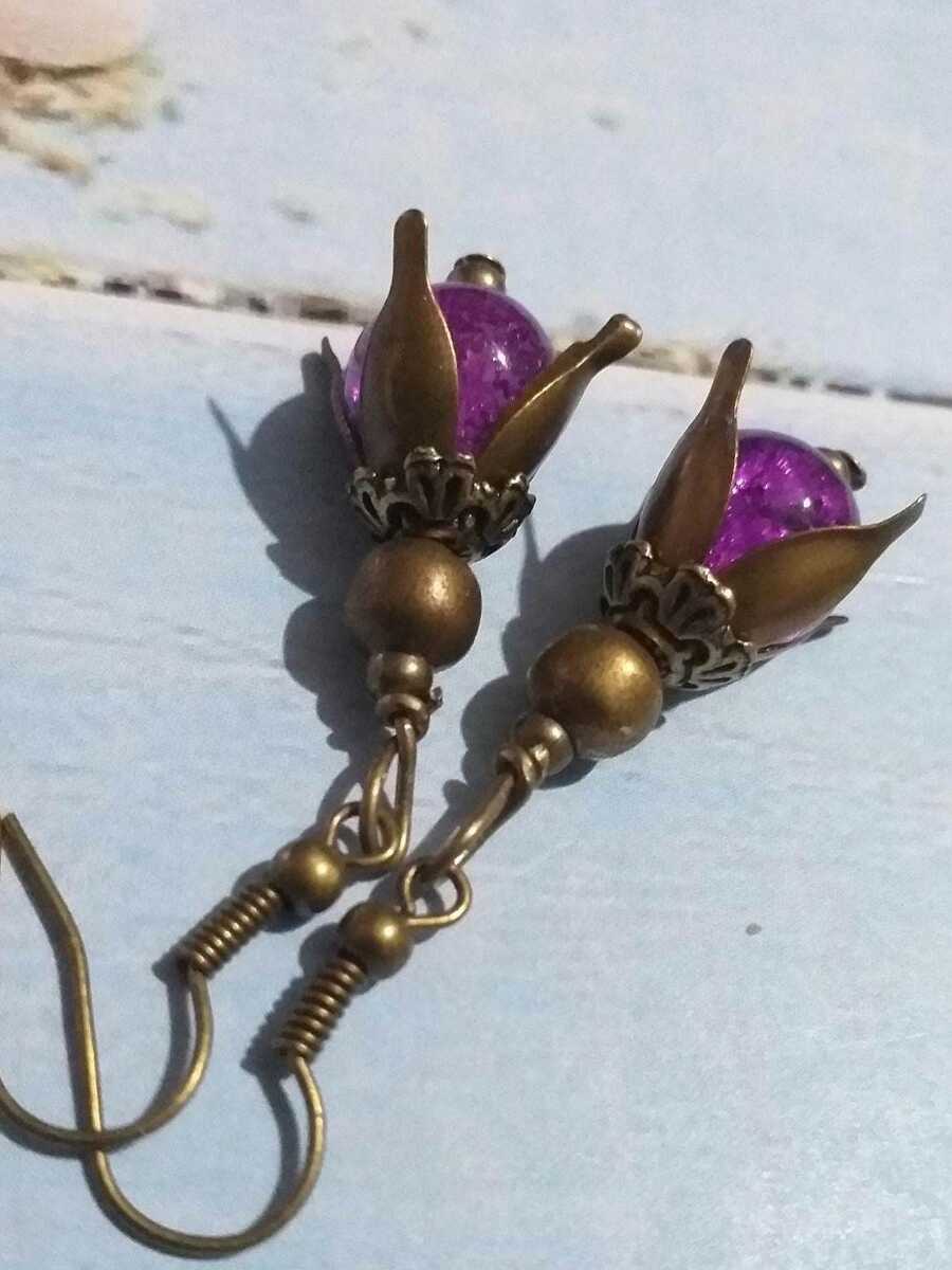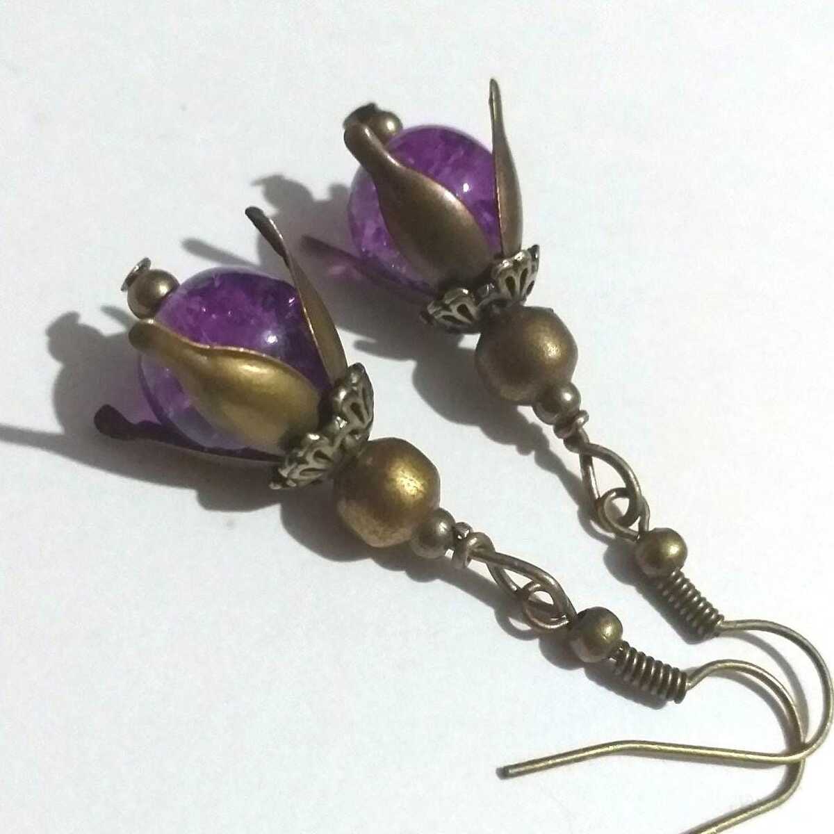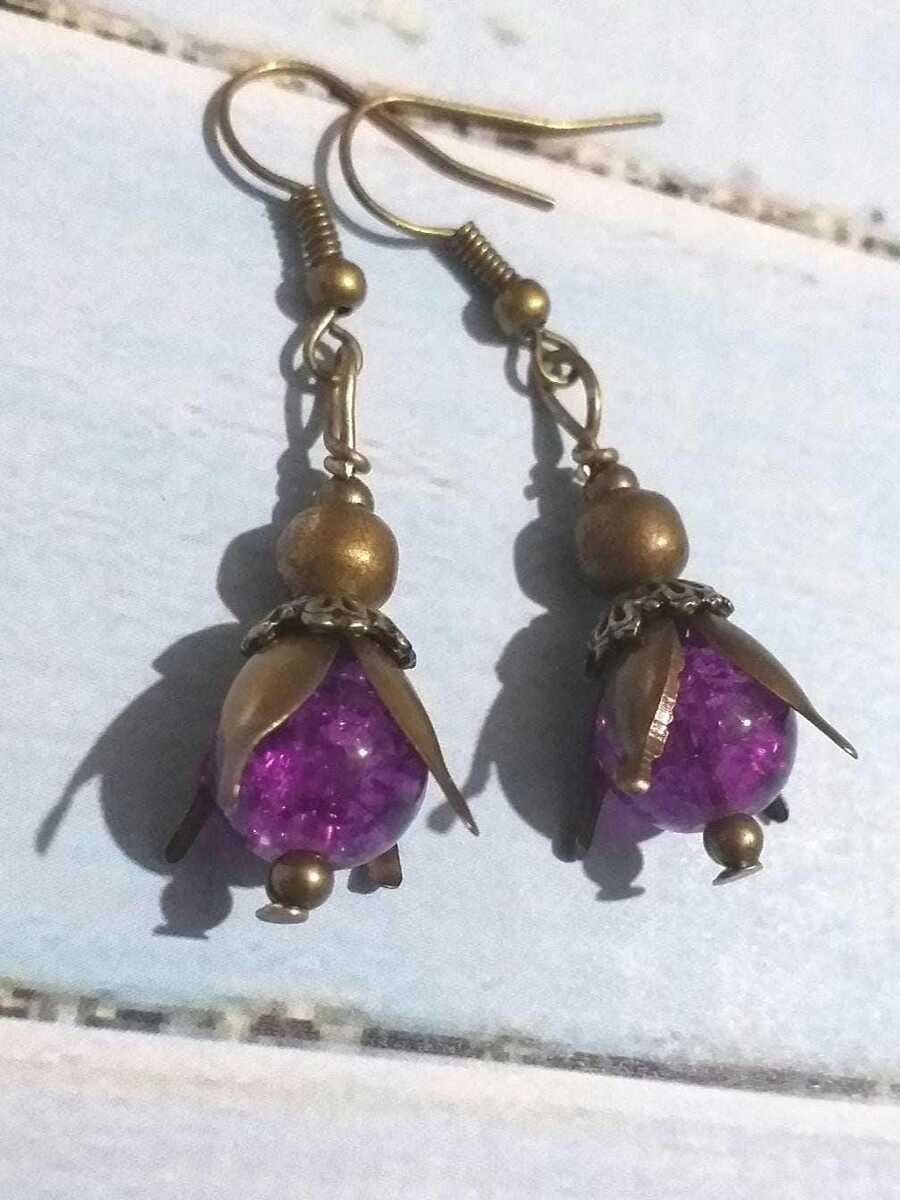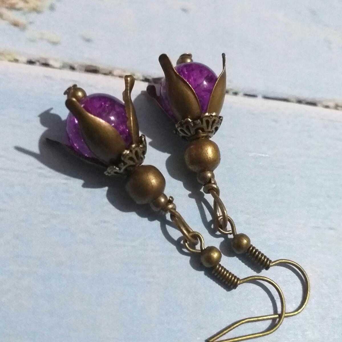 Beautiful bronze Victorian style earrings with purple crackle glass beads and fine ornaments . Antique style bronze tone purple flower-bell earrings . Boho earrings. Bohemian earrings . Romantic style earrings . Baroque style earrings . Beautiful purple earrings.