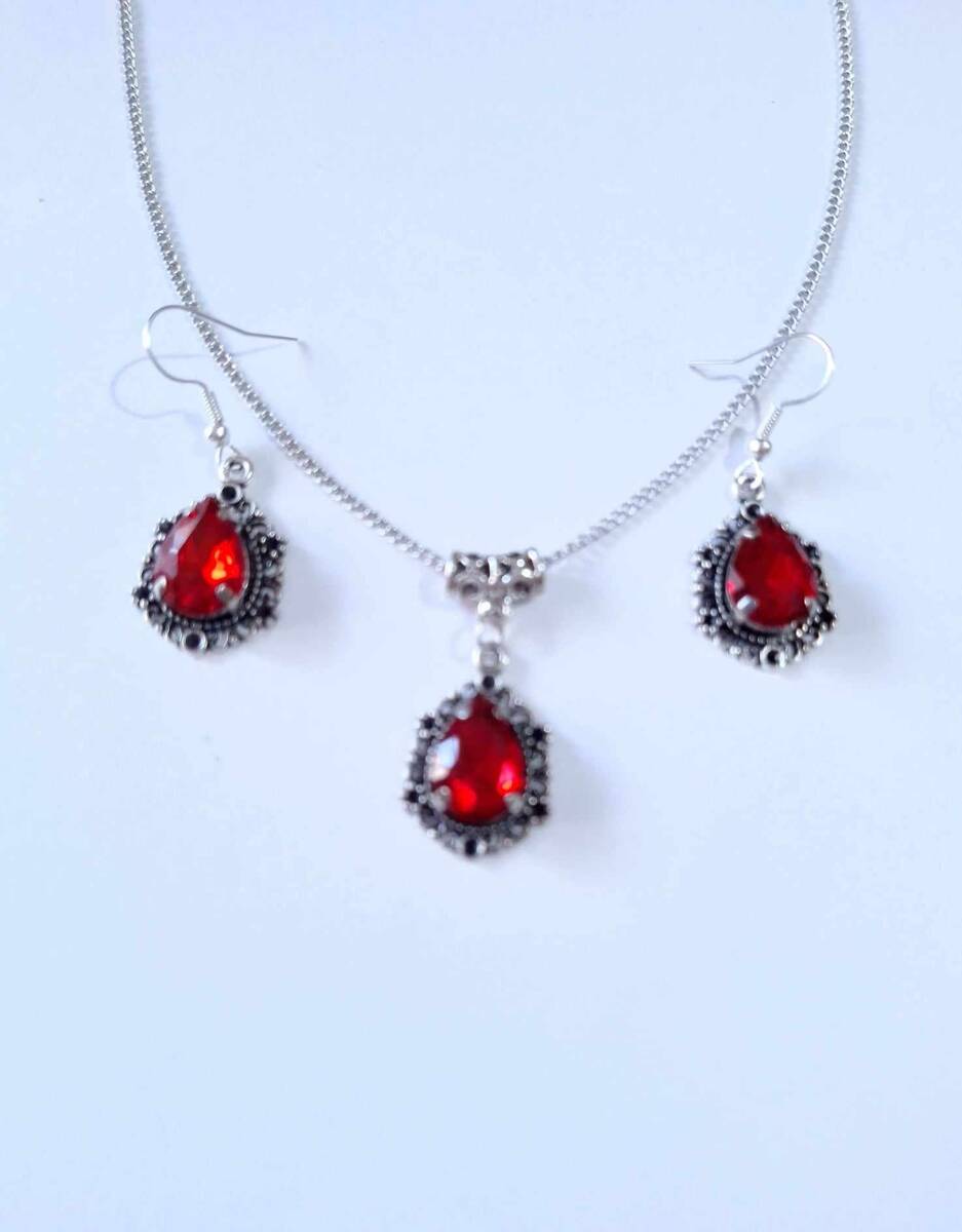 Silver Red Victorian set necklace earrings . Bohemian necklace and earrings .