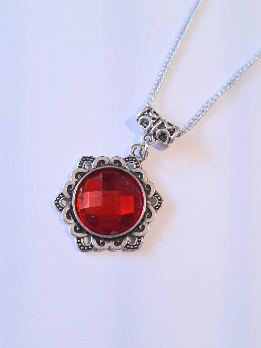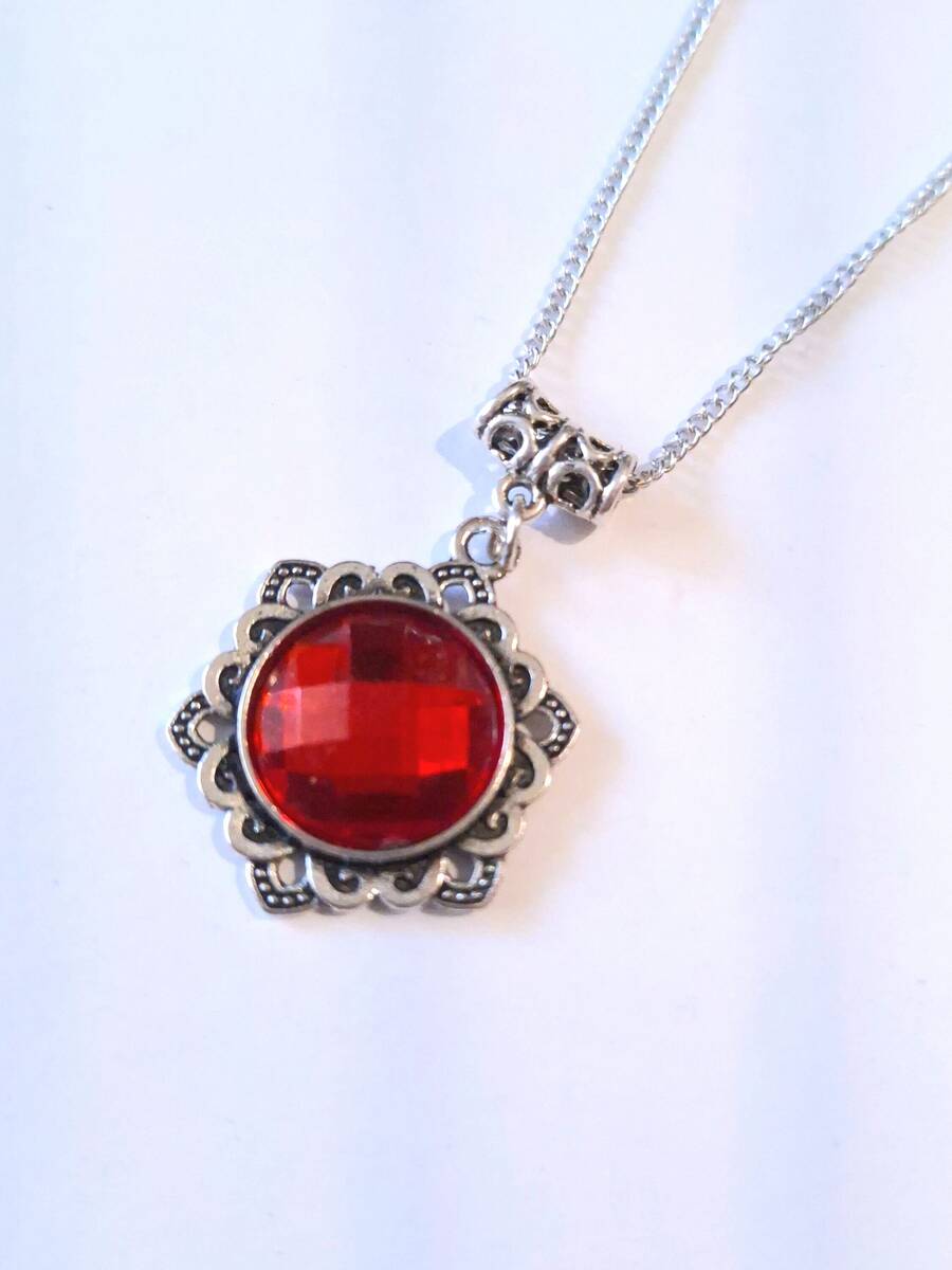 Material: silver toned metal ornaments , red faceted plastic circle cabochon, silver toned chain