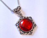 Beautiful Set of silver-tone Antique style ornamented floral leaves base and acrylic faux crystals circle faceted cabochons. Ruby red necklace and earrings. Silver tone pendant Victorian style necklace and earrings. Boho necklace. Bohemian necklace and earrings. Romantic necklace and earrings.