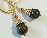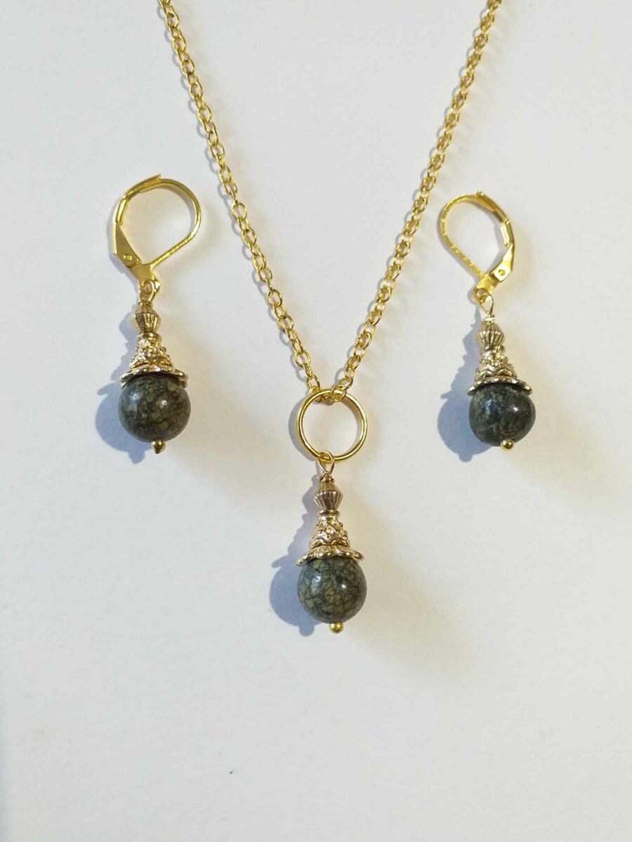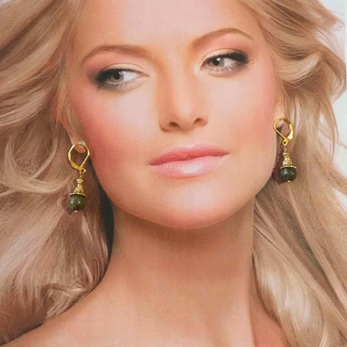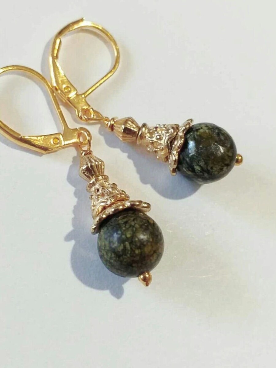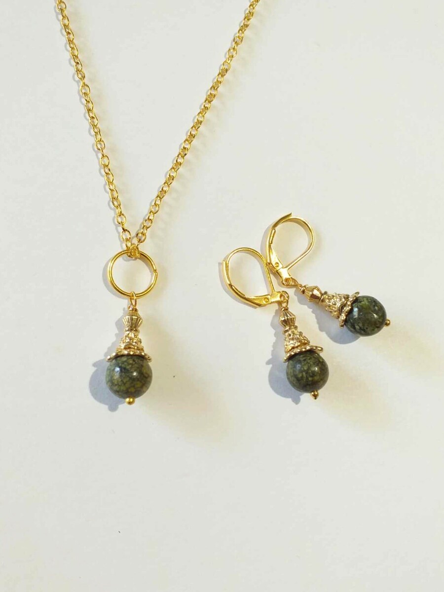 Beautiful Serpentine and gold ornaments jewelry set . Victorian Serpentine jewelry set earrings and necklace . Gold-tone beautiful Boho set teardrop earrings and necklace . Bohemian earrings . Bohemian necklace. Victorian style gold-tone green Serpentine gemstones dangle earrings and necklace with a beautiful ornamented gold-tone caps and beads . Romantic jewelry set Serpentine earrings and Serpentine necklace .