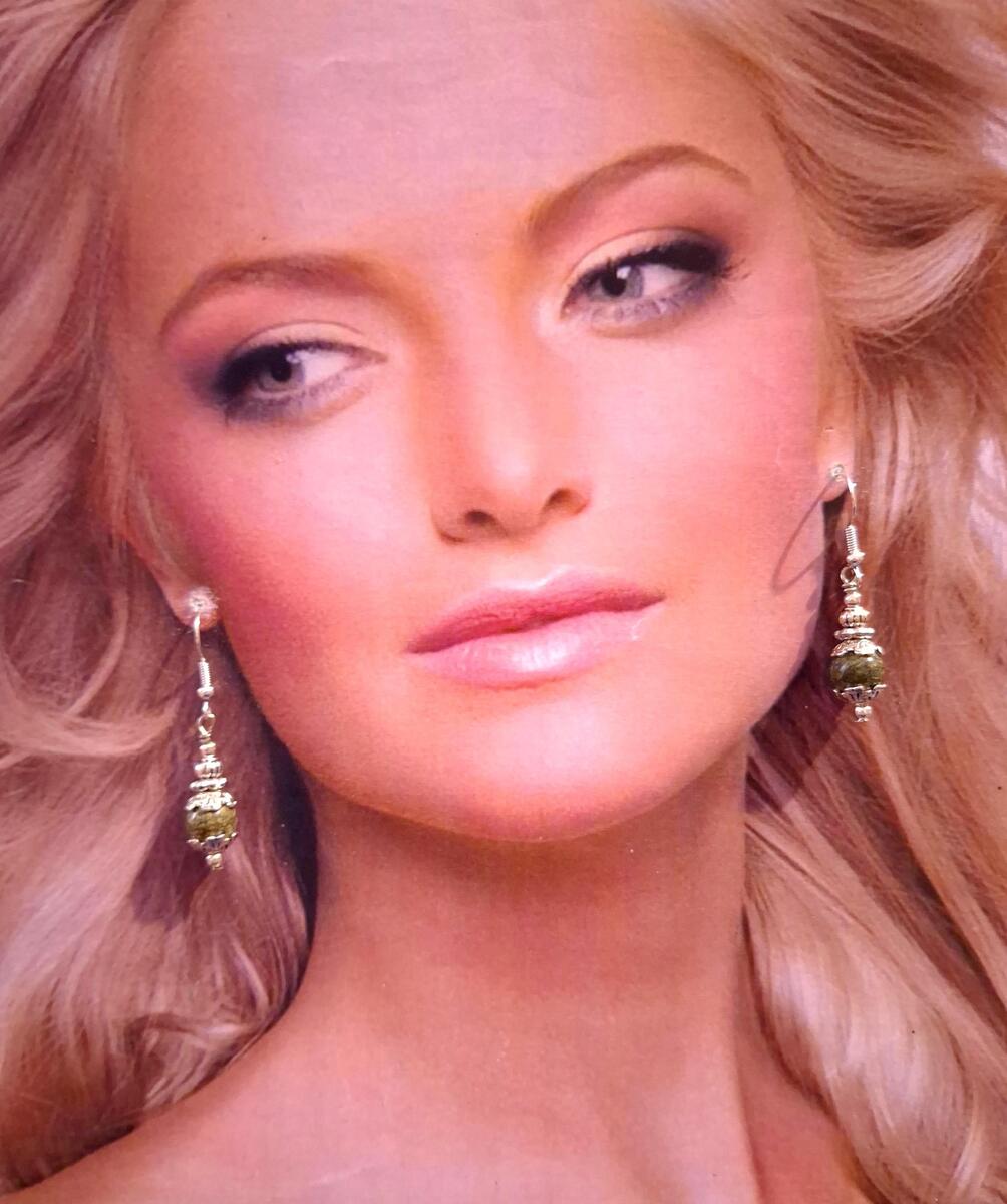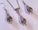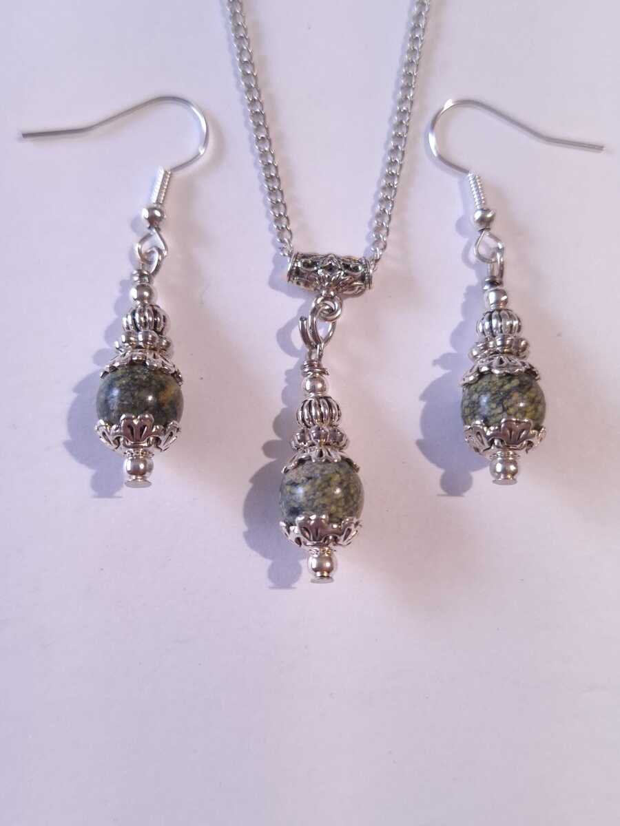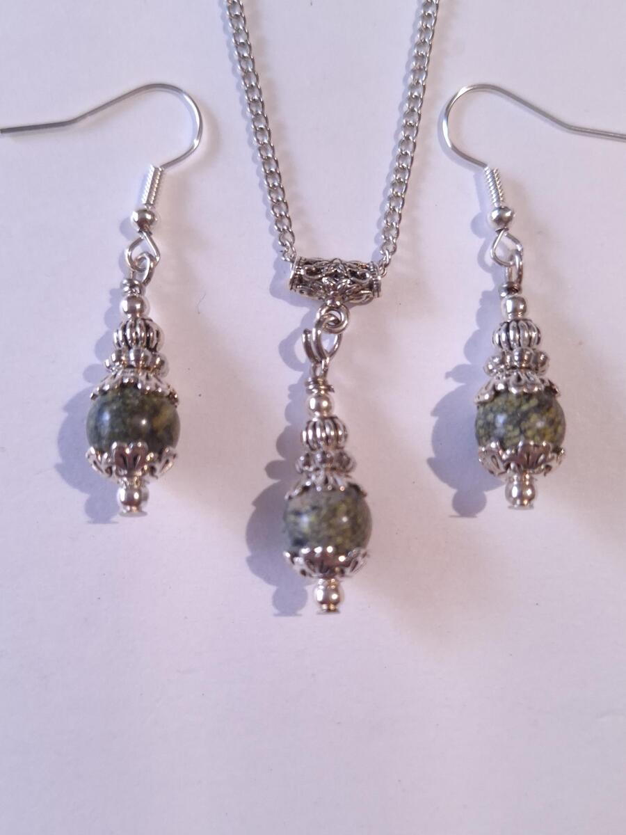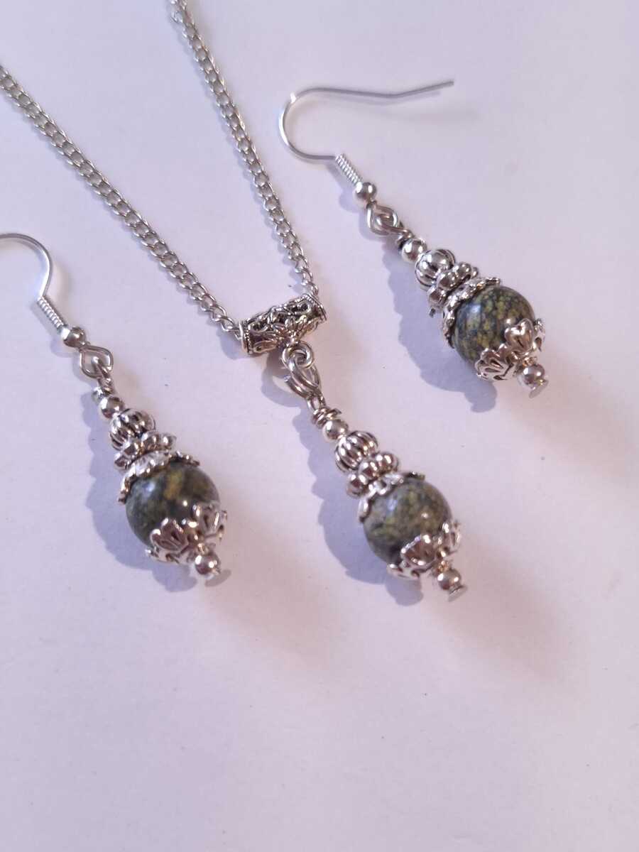 Beautiful genuine Serpentine and silver-tone ornaments jewelry set . Victorian Serpentine jewelry set earrings and necklace . Silver-tone beautiful Boho set teardrop dangling earrings and necklace . Bohemian earrings . Bohemian necklace. Victorian style silver-tone green Serpentine gemstones dangle earrings and necklace with a beautiful ornamented silver-tone caps and metal and plastic beads . Romantic jewelry set Serpentine earrings and Serpentine necklace .
