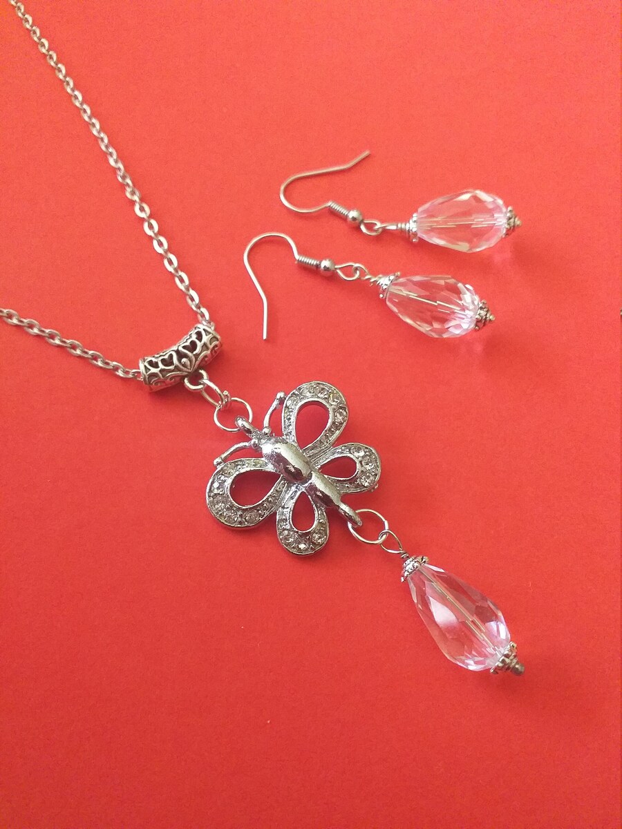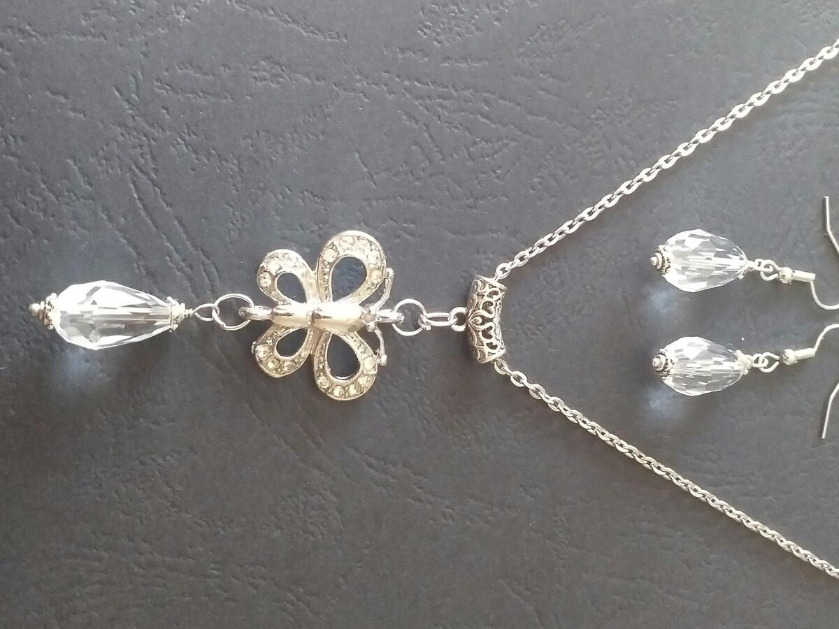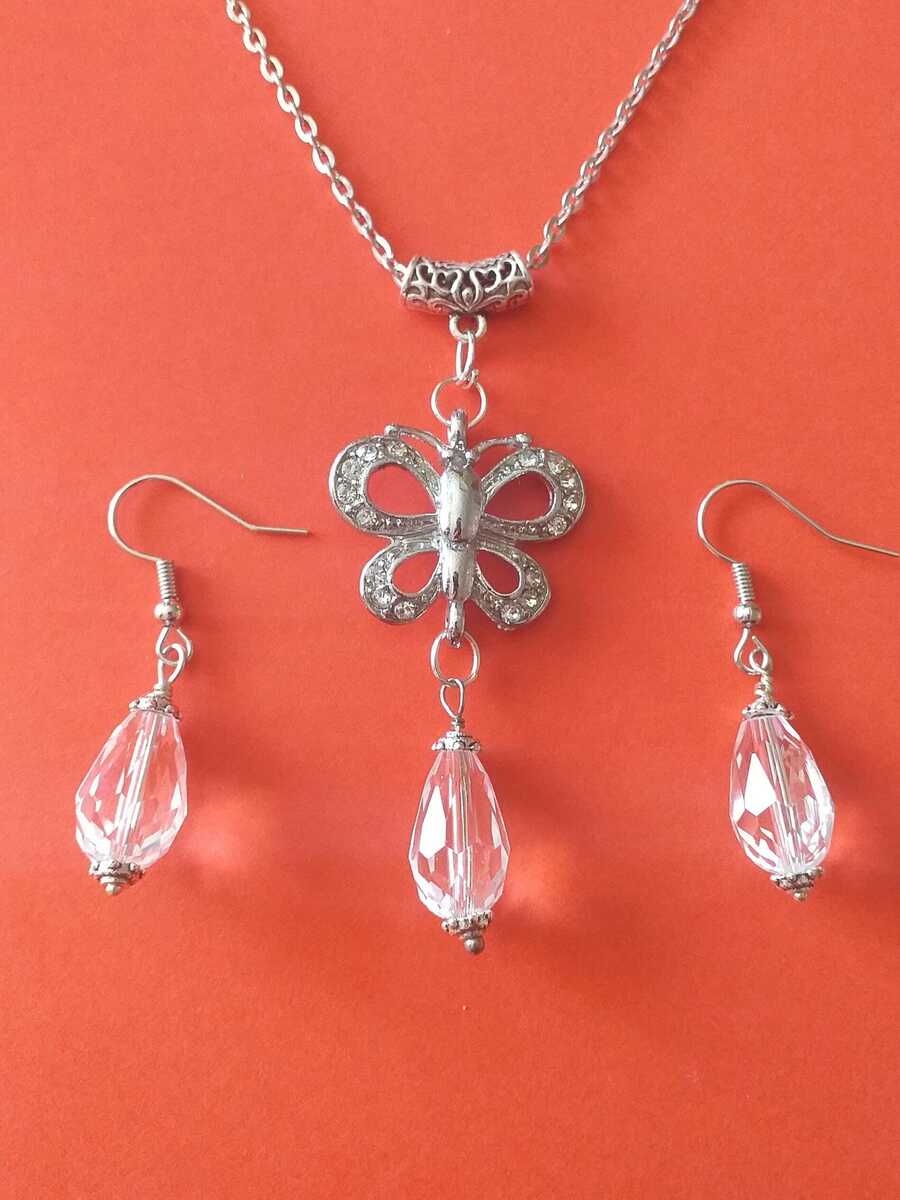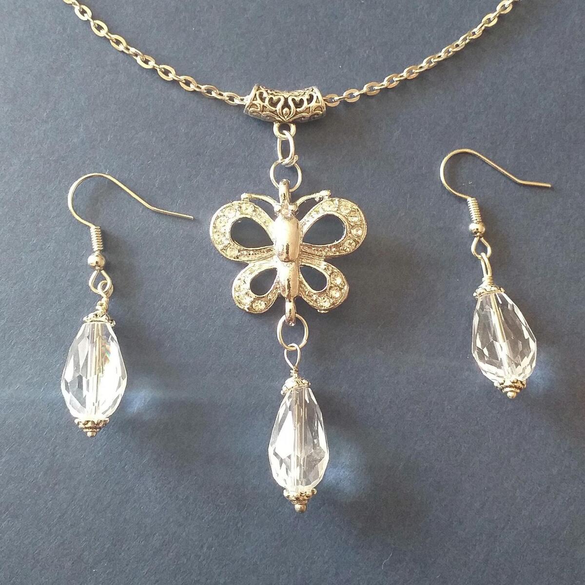 Victorian Silver set butterfly Crystal set necklace earrings jewelry set Boho set Silver set crystal pendant set Vintage set Gift jewelry set
