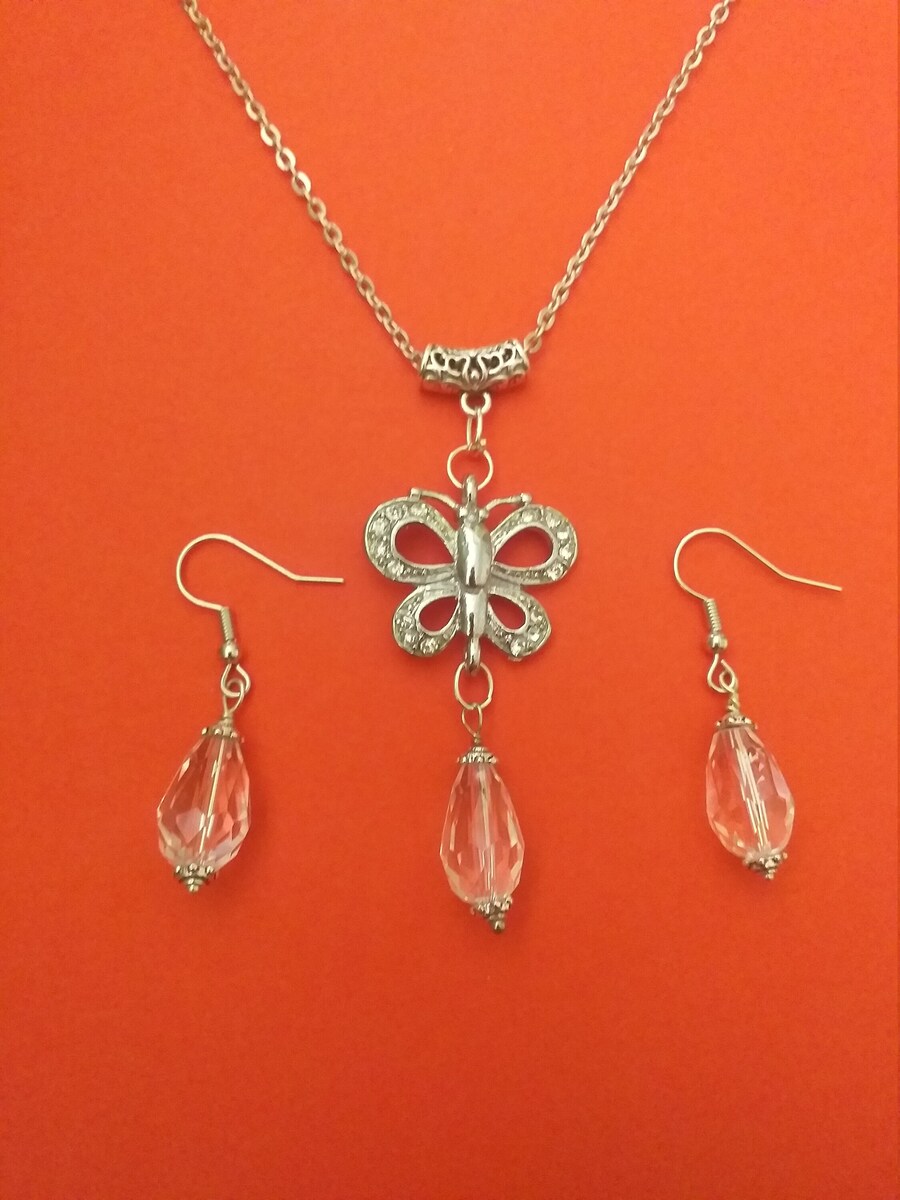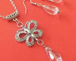 Silver Victorian set beautiful Butterfly zircons pendant and clear faceted crystal with teardrop shaped necklace and same style earrings . Bohemian necklace and earrings .